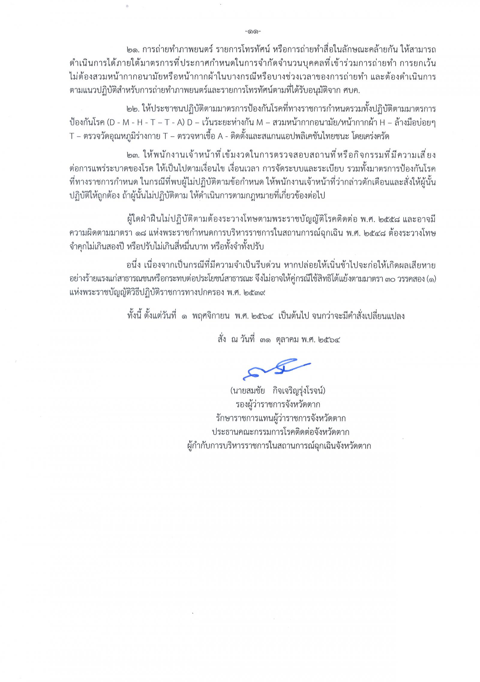 คำสั่งจังหวัดตาก ที่ 4162/2564 เรื่องมาตรการป้องกันควบคุมโรคติดเชื้อไวรัสโคโรนา 2019 (โควิด-19) จังหวัดตาก