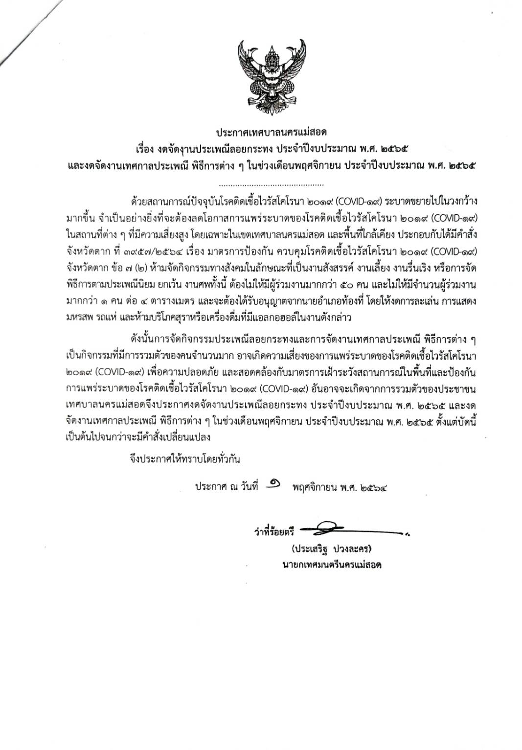 ประกาศเทศบาลนครแม่สอด เรื่อง งดจัดงานประเพณีลอยกระทง ประจำปีงบประมาณ พ.ศ. 2565 และงดจัดงานเทศกาลประเพณี พิธีการต่างๆในช่วงเดือนพฤศจิกายน ประจำปีงบประมาณ พ.ศ. 2565