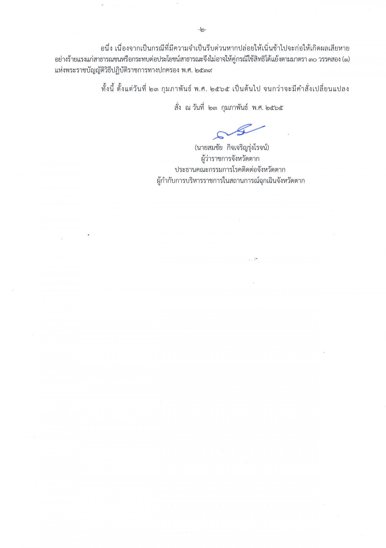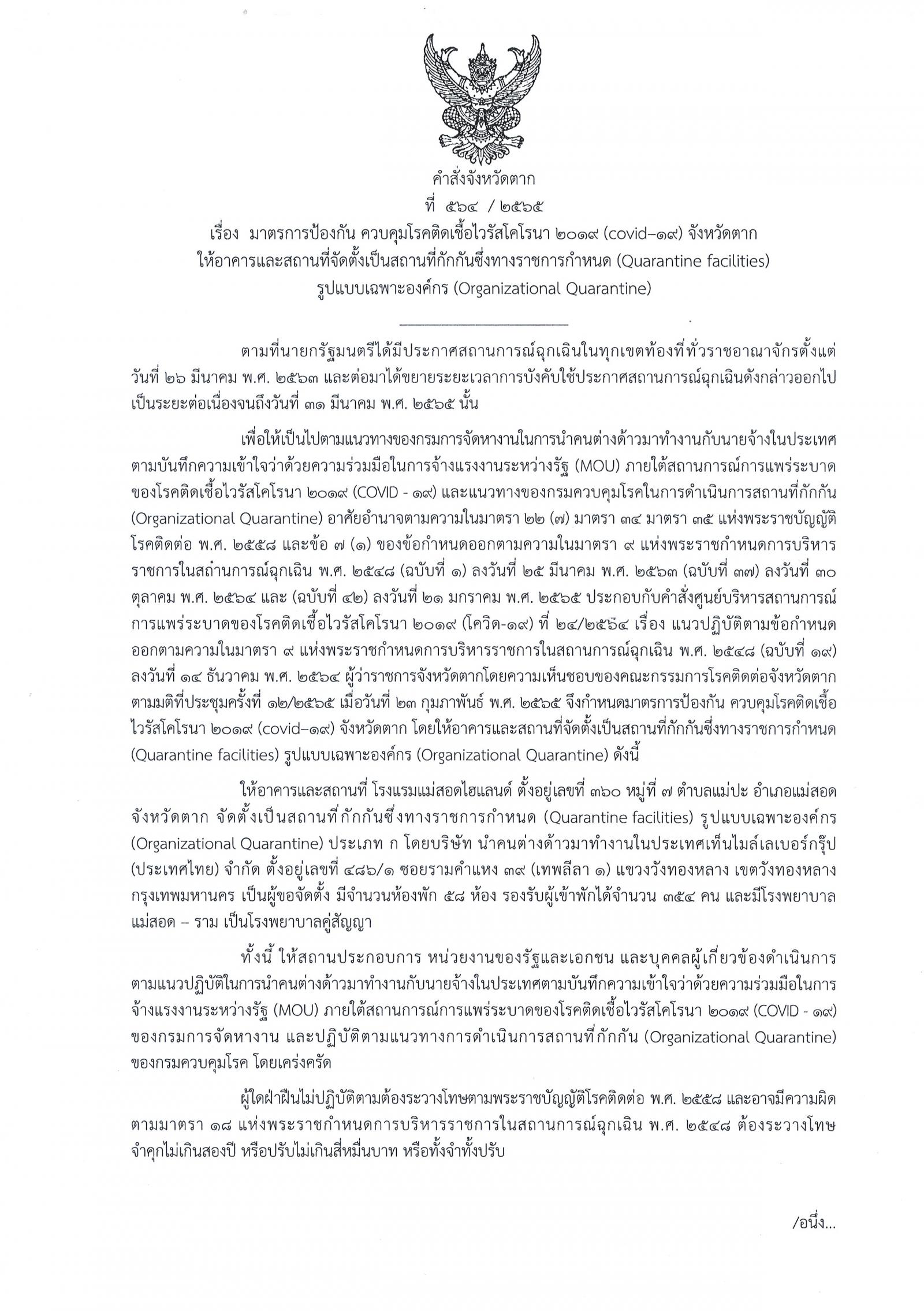 คำสั่งจังหวัดตากที่ 564 / 2565 เรื่อง มาตรการป้องกัน ควบคุมโรคติดเชื้อไวรัสโคโรนา 2019 (covid–19) จังหวัดตาก ให้อาคารและสถานที่จัดตั้งเป็นสถานที่กักกันซึ่งทางราชการกำหนด (Quarantine facilities) รูปแบบเฉพาะองค์กร (Organizational Quarantine)