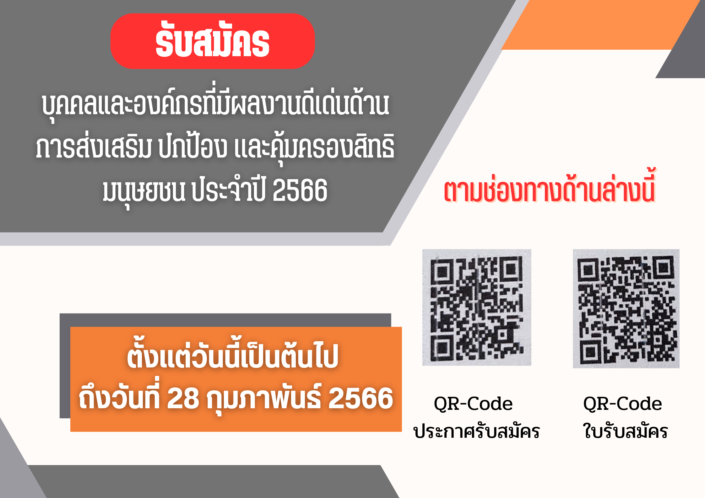 ประชาสัมพันธ์การรับสมัครบุคคลและองค์กรที่มีผลงานดีเด่นด้านการส่งเสริม ปกป้อง และคุ้มครองสิทธิมนุษยชน ประจำปี 2566 (เพิ่มเติม)