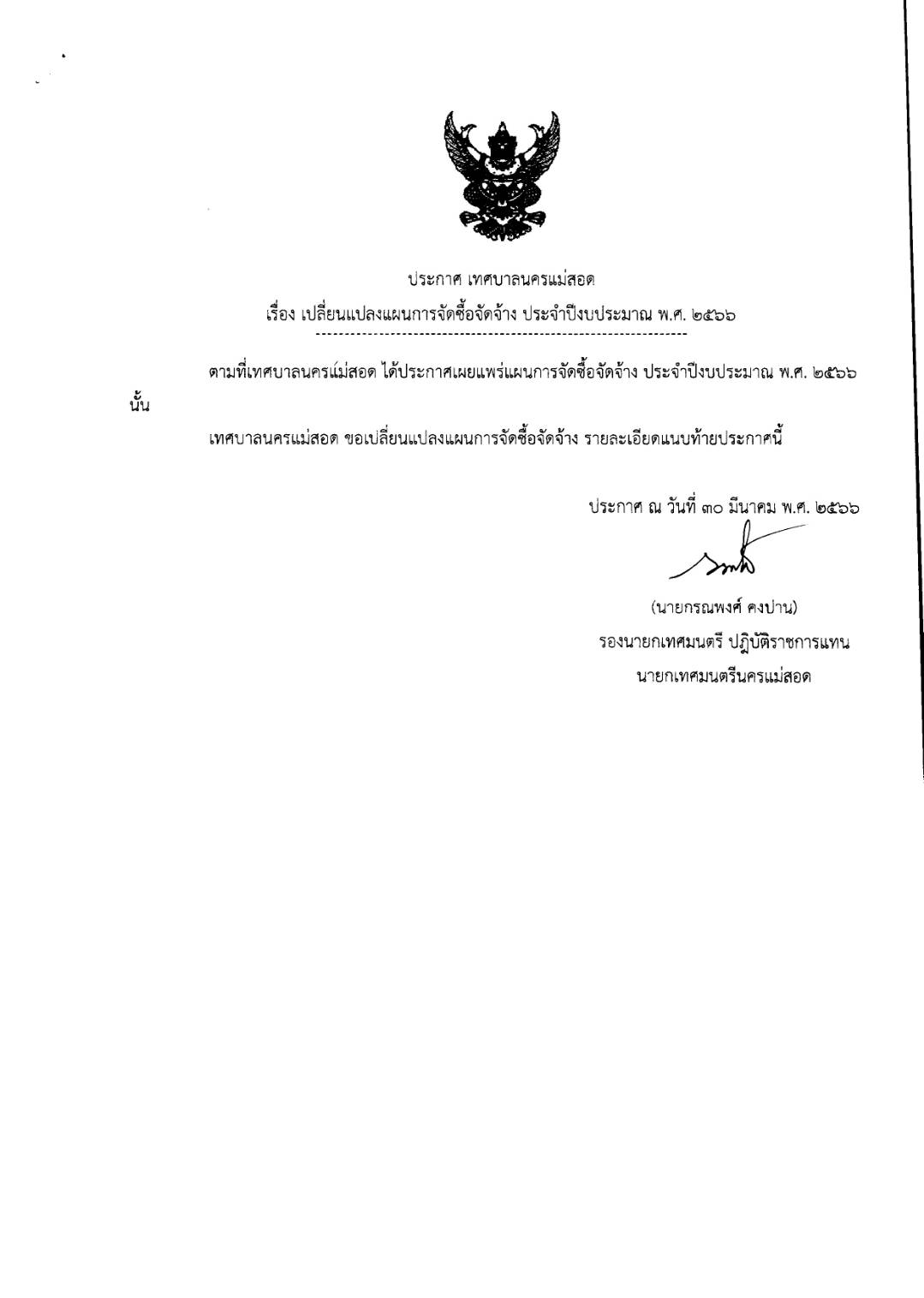 ประกาศเทศบาลนครแม่สอด เรื่อง เผยแพร่แผนการจัดซื้อจัดจ้าง ประจำปีงบประมาณ พ.ศ.2566 (ลงวันที่ 30 มี.ค. 2566)