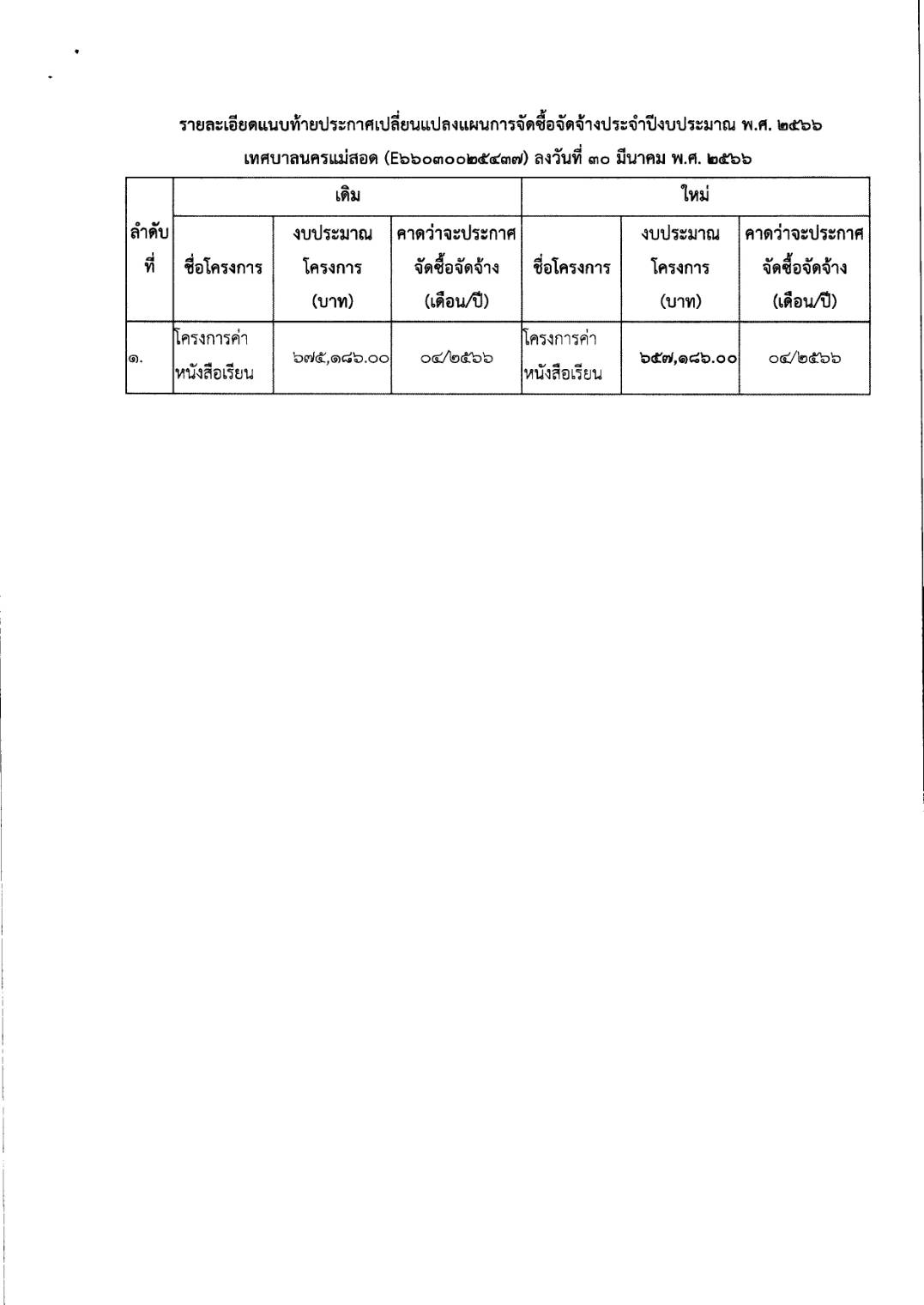 ประกาศเทศบาลนครแม่สอด เรื่อง เผยแพร่แผนการจัดซื้อจัดจ้าง ประจำปีงบประมาณ พ.ศ.2566 (ค่าหนังสือเรียน ลงวันที่ 30 มี.ค. 2566)