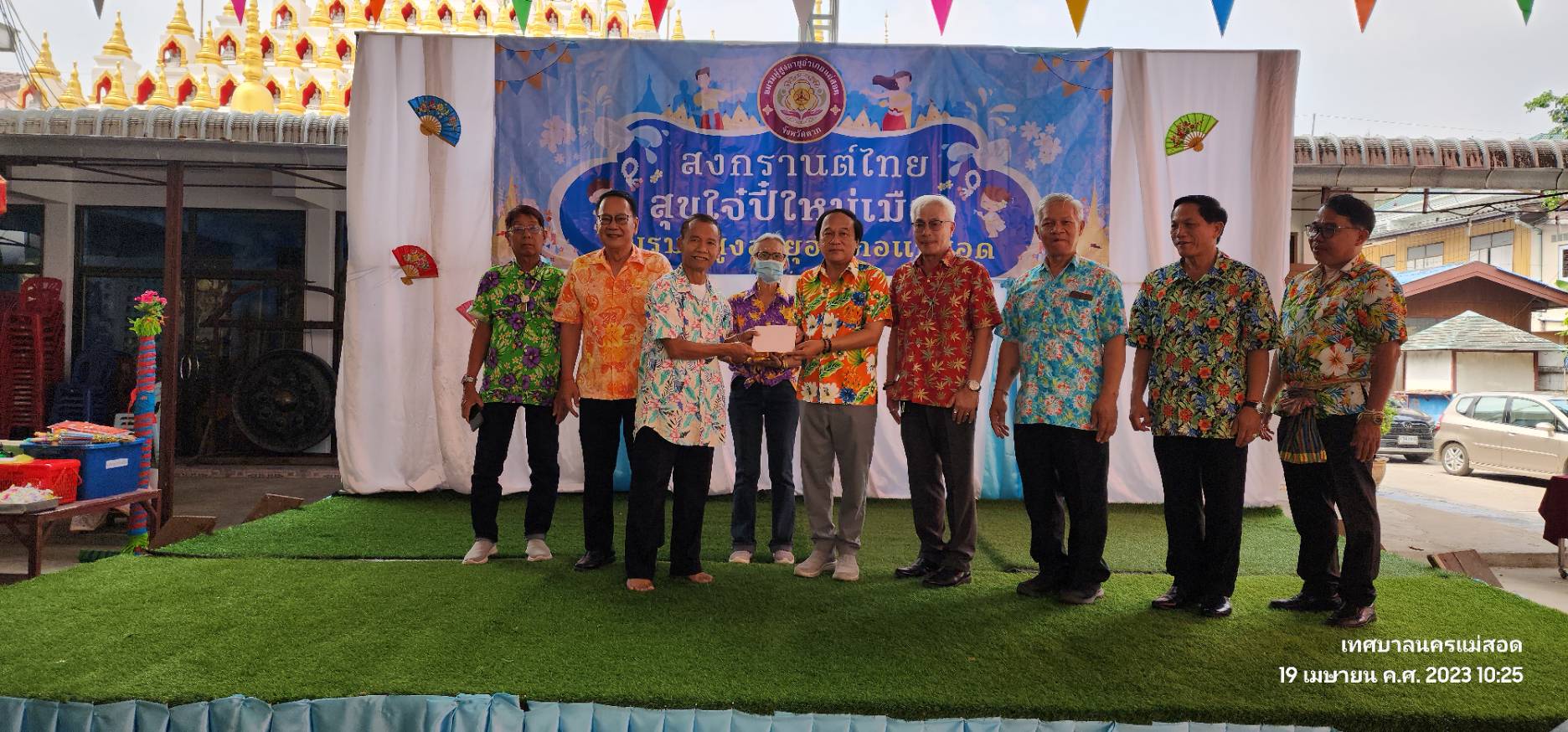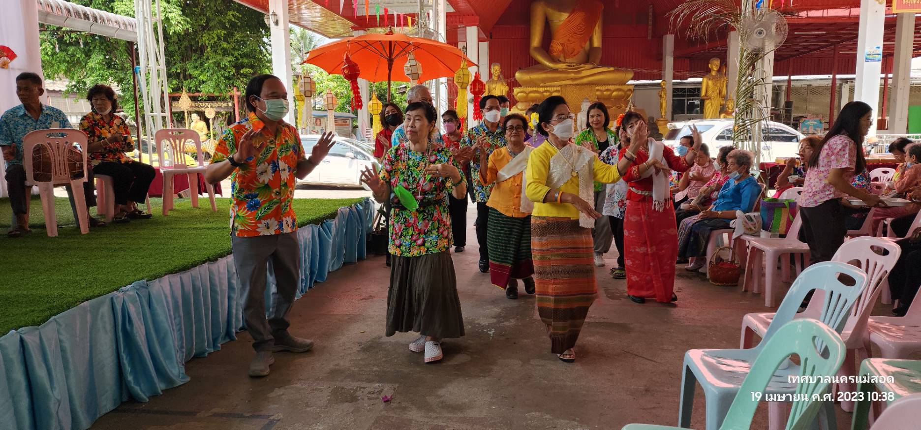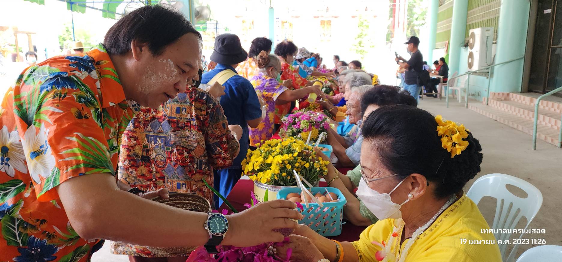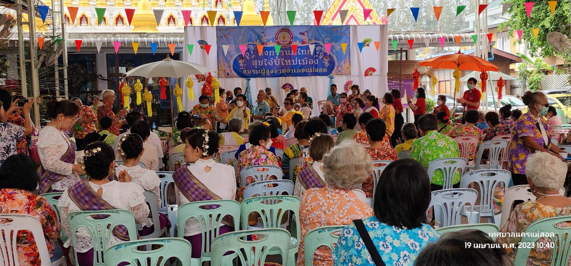 ว่าที่ร้อยตรี ประเสริฐ ปวงละคร นายกเทศมนตรีนครแม่สอด พร้อมด้วยคณะผู้บริหาร สมาชิกสภาเทศบาล และเจ้าหน้าที่ที่เกี่ยวข้องเทศบาลนครแม่สอด เข้าร่วมงานสงกรานต์ไทย สุขใจ๋ปี๋ใหม่เมืองชมรมผู้สูงอายุอำเภอแม่สอด โดยมีกิจกรรมสรงน้ำพระพุทธรูป ใส่บาตรข้าวสารอาหารแห้ง กิจกรรมการแสดงผู้สูงอายุ และรดน้ำดำหัวขอพรผู้ใหญ่ เพื่อให้ผู้สูงอายุได้มีโอกาสพบปะสังสรรค์ แลกเปลี่ยนความคิดเห็น ทำกิจกรรมส่งเสริมสุขภาพร่วมกัน สร้างการมีส่วนร่วมในกิจกรรมทางสังคม ร่วมสืบสานประเพณีสงกรานต์ ส่งเสริมการอนุรักษ์ ศิลปะ ประเพณี วัฒนธรรม และภูมิปัญญาท้องถิ่น