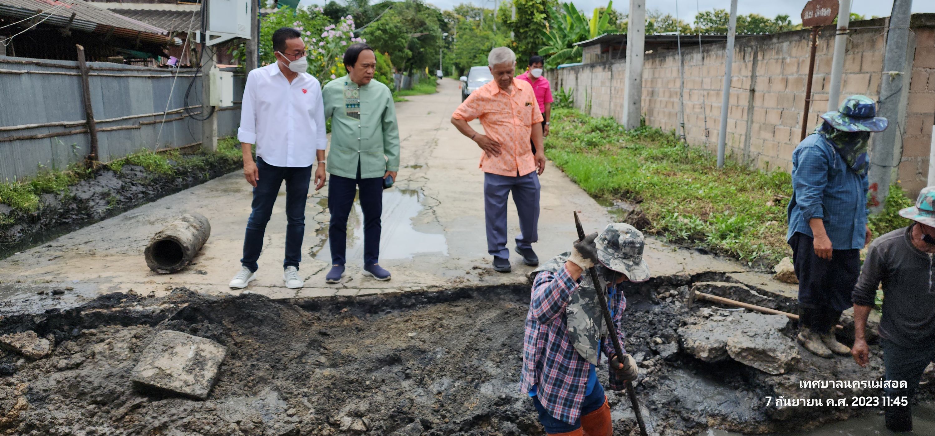 ว่าที่ร้อยตรี ประเสริฐ ปวงละคร นายกเทศมนตรีนครแม่สอด พร้อมด้วยคณะผู้บริหาร สมาชิกสภาเทศบาล ผู้อำนวยการกองและเจ้าหน้าที่กองช่างสุขาภิบาล ลงพื้นที่ดำเนินการวางท่อระบายน้ำ บริเวณสี่แยกพรพระวอ ชุมชนสักทอง และชุมชนประชารักษ์ เพื่อแก้ไขปัญหาน้ำท่วมขังให้กับประชาชน