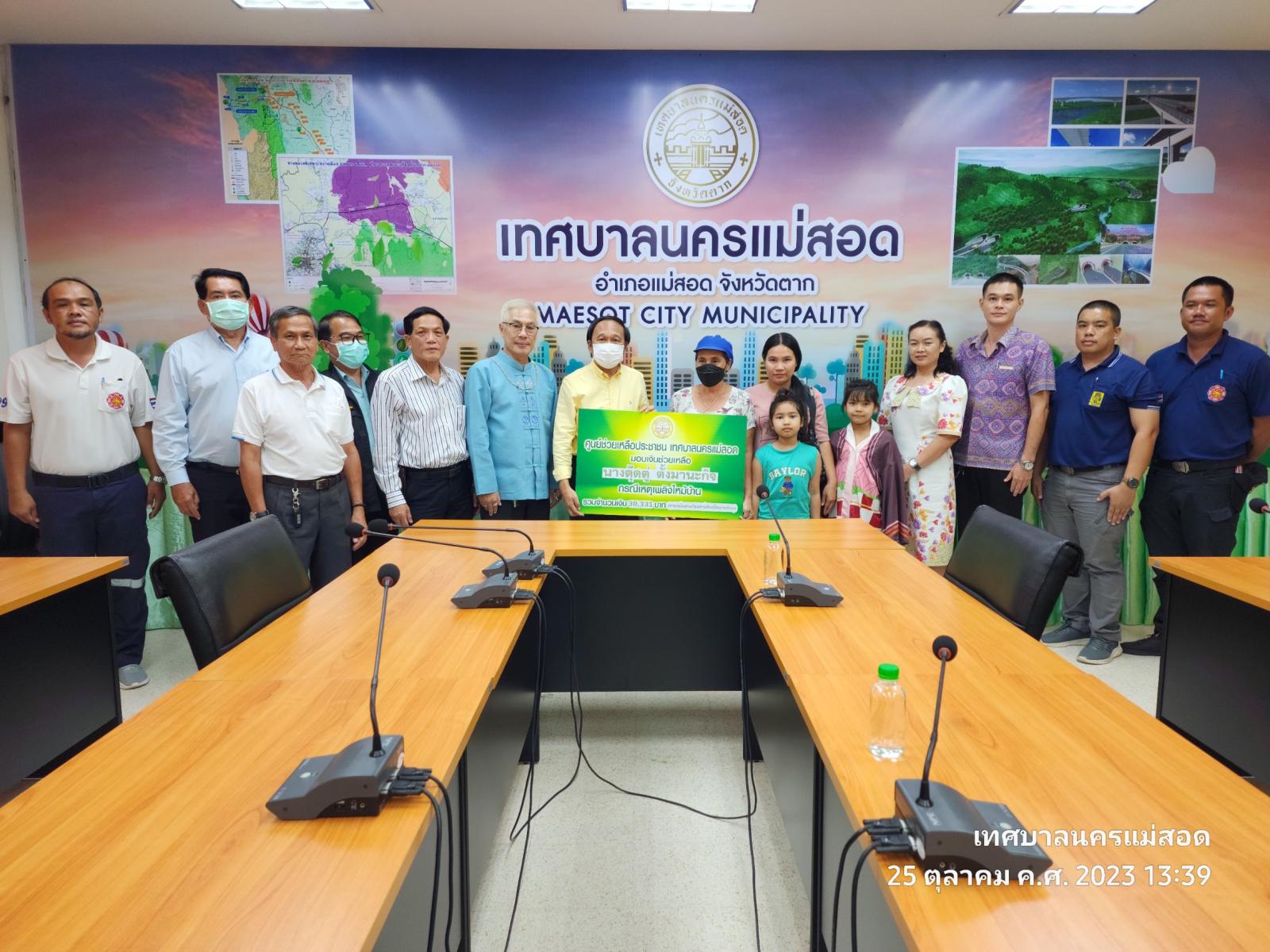 ว่าที่ร้อยตรี ประเสริฐ ปวงละคร นายกเทศมนตรีนครแม่สอด พร้อมด้วยคณะผู้บริหาร สมาชิกสภาเทศบาล รองปลัดเทศบาล หัวหน้าส่วนราชการและเจ้าหน้าที่ที่เกี่ยวข้อง เข้าร่วมเป็นเกียรติในพิธีมอบเงินช่วยเหลือนางตุ๊ดตู่ ตั้งมานะกิจ กรณีเหตุเพลิงไหม้บ้าน โดยศูนย์ช่วยเหลือประชาชนเทศบาลนครแม่สอด รวมจำนวนเงิน 30,331 บาท
