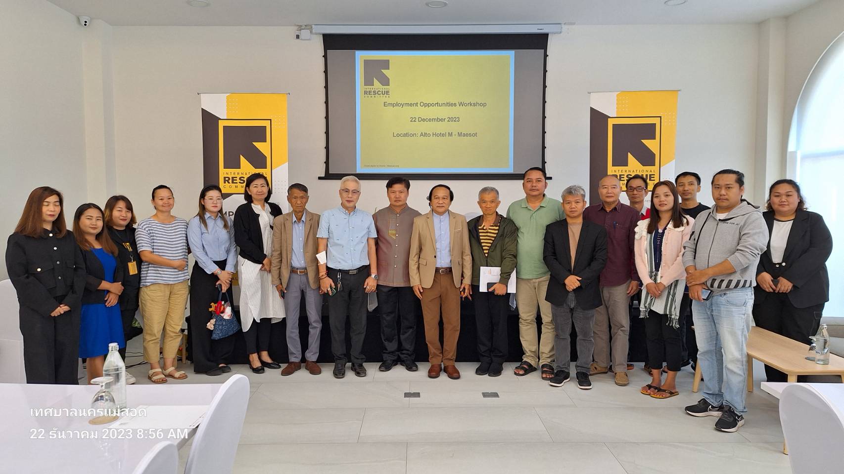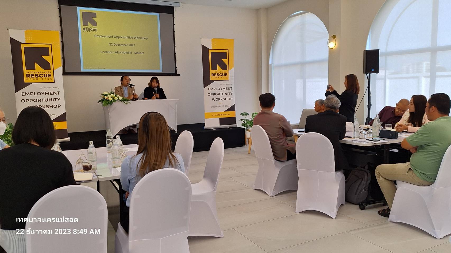 ว่าที่ร้อยตรี ประเสริฐ ปวงละคร นายกเทศมนตรีนครแม่สอด พร้อมด้วยนายกรกฤตย์ กรัณยพัฒนพงศ์ เลขานุการนายกเทศมนตรีนครแม่สอด เข้าร่วมการประชุมสัมมนาเชิงปฏิบัติการ.(Workshop) โอกาสการจ้างงาน โดยมีวัตถุประสงค์เพื่อปรับปรุงความคืบหน้าของการสนับสนุนสิทธิในการทำงาน แบ่งปันมุมมองของนายจ้างเกี่ยวกับการจ้าง ผู้อพยพ ผู้ลี้ภัยและโอกาสในการจ้างงานสำหรับผู้ลี้ภัยรวมถึงนโยบายการย้ายถิ่นฐานและการตอบรับจากความมั่นคงแห่งชาติ
