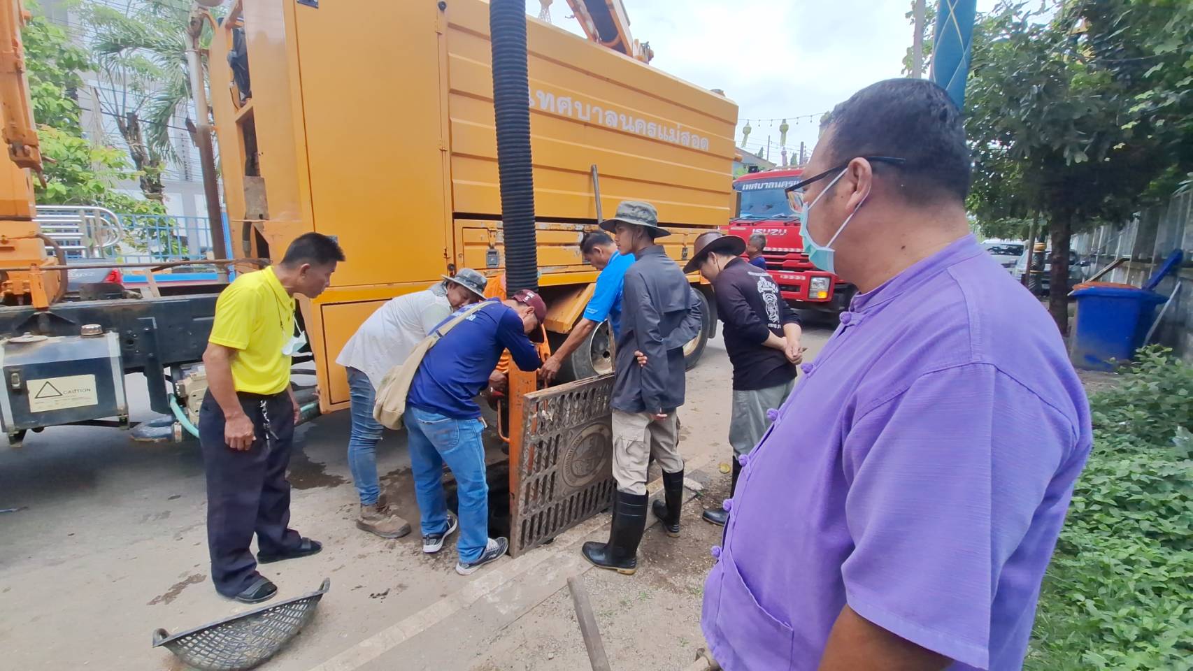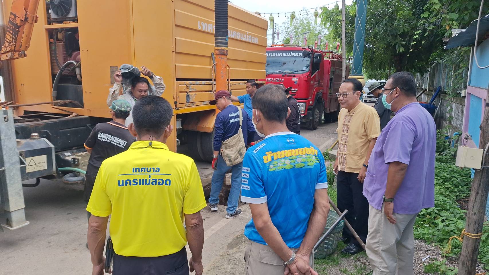 ว่าที่ร้อยตรี ประเสริฐ ปวงละคร นายกเทศมนตรีนครแม่สอด มอบหมายให้ นายไกรสร กิจการ รองนายกเทศมนตรีเทศบาลนครแม่สอด นายประสาน มั่นมาก รองปลัดเทศบาลนครแม่สอด สมาชิกสภาเทศบาล กองช่างสุขาภิบาล และเจ้าหน้าที่ที่เกี่ยวข้อง ลงพื้นที่ดำเนินการดูดโคลนและขุดลอกท่อระบายน้ำ ในเขตพื้นที่เทศบาลนครแม่สอด บริเวณถนนข้างโรงเรียนเทศบาลวัดชุมพลคีรี ชุมชนชุมพลพัฒนา