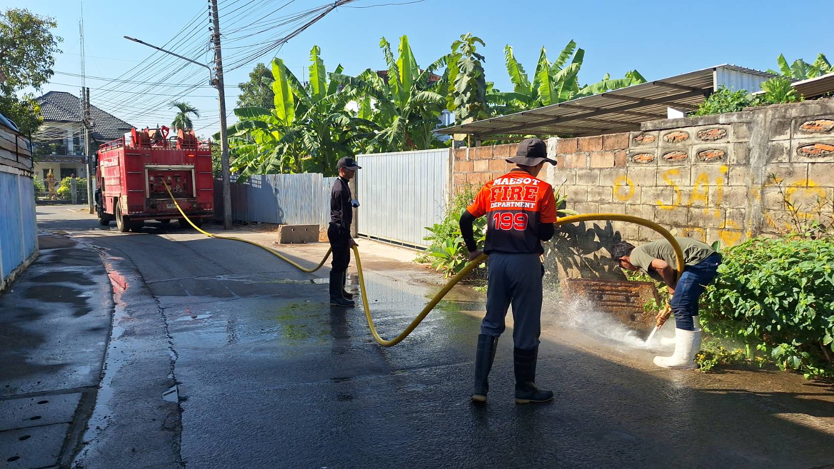 ว่าที่ร้อยตรี ประเสริฐ ปวงละคร นายกเทศมนตรีนครแม่สอด มอบหมายให้ นายไกรสร กิจการ รองนายกเทศมนตรี พร้อมด้วย รองประธานสภาเทศบาล ที่ปรึกษานายก สมาชิกสภาเทศบาล เจ้าหน้าที่กองสาธารณสุขและสิ่งแวดล้อม และเจ้าหน้าที่ฝ่ายป้องกันและบรรเทาสาธารณภัยนครแม่สอด ลงพื้นที่ดำเนินการฉีดล้างทำความสะอาดท่อระบายน้ำชุมชนร่วมใจ