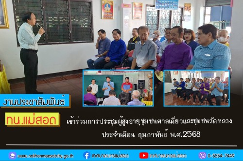 ว่าที่ร้อยตรี ประเสริฐ ปวงละคร นายกเทศมนตรีนครแม่สอด พร้อมด้วย คณะผู้บริหาร สมาชิกสภาเทศบาล เจ้าหน้าที่คลินิกชุมชนอบอุ่น กองสาธารณสุขและสิ่งแวดล้อม และเจ้าหน้าที่ที่เกี่ยวข้อง เข้าร่วมการประชุมผู้สูงอายุชุมชนตาลเดี่ยวและชุมชนวัดหลวง ประจำเดือน กุมภาพันธ์ พ.ศ.2568 โดยมีการจัดกิจกรรมนันทนาการส่งเสริมสุขภาพ การชี้แจงข่าวสารจากทางเทศบาลนครแม่สอดร่วมพบปะพูดคุย เพื่อเปิดโอกาสให้ผู้สูงอายุในชุมชนได้แลกเปลี่ยนความคิดเห็น และทำกิจกรรมร่วมกัน และมีการตรวจสุขภาพเบื้องต้น