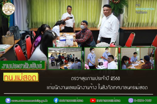 โดยกองสาธารณสุขและสิ่งแวดล้อม คลินิกชุมชนอบอุ่นร่วมกับกลุ่มงานอาชีวเวชกรรมโรงพยาบาลแม่สอด ดำเนินการตรวจสุขภาพประจำปี 2568 แก่พนักงานและพนักงานจ้าง ในสังกัดเทศบาลนครแม่สอด เพื่อเป็นการส่งเสริมสุขภาพ ตลอดจนสร้างขวัญและกำลังใจให้แก่บุคลากร โดยมุ่งหวังให้เกิดกิจกรรมการตรวจสุขภาพประจำปี ให้แก่บุคลากรของเทศบาลทุกคน ตามโปรแกรมตรวจสุขภาพจากหน่วยงานที่ได้มาตรฐาน เพื่อให้บุคลากรเหล่านี้มีสุขภาพที่ดี สามารถปฏิบัติงานได้อย่างมีประสิทธิภาพ ซึ่งจะส่งผลให้ประชาชนได้รับการบริการที่ดีต่อไป