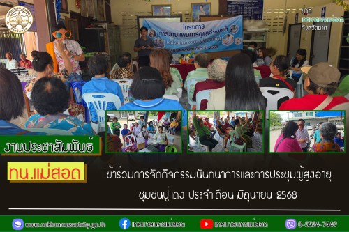 โดยมี นายกุล เครือวีระ นายกเทศมนตรีนครแม่สอด มอบหมายให้ นายจิรวัฒน์ มงคลจุฑาเศรษฐ รองนายกเทศมนตรี พร้อมด้วย นายไพรัช นาคำ สมาชิกสภาเทศบาล นายสุมิตร กัญจะนะ ผู้อำนวยการกองสวัสดิการสังคมและเจ้าหน้าที่กองสวัสดิการสังคม เข้าร่วมการจัดกิจกรรมนันทนาการและการประชุมผู้สูงอายุชุมชนปู่แดง ประจำเดือน มิถุนายน 2568 โดยได้รับการสนับสนุนจากสปสช.ให้ดำเนินโครงการ ส่งเสริมสุขภาพผู้สูงอายุ แบบองค์รวม ประจำปีงบประมาณ 2568 และทางศูนย์สุขภาพชุมชนโรงพยาบาลแม่สอด ได้ทำการตรวจคัดกรองสุขภาพ ชั่งน้ำหนัก วัดส่วนสูง วัดรอบเอว วัดความดันโลหิต กิจกรรมไหว้พระสวดมนต์ นั่งสมาธิ และกิจกรรมนันทนาการ