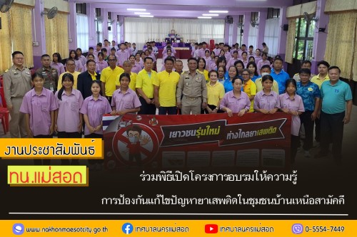 โดยมี นายกุล เครือวีระ นายกเทศมนตรีนครแม่สอด เป็นประธานในพิธีเปิด พร้อมด้วย เลขานุการนายก สมาชิกสภาเทศบาล คณะครูและนักเรียนโรงเรียนเทศบาลวัดบุญญาวาส และเจ้าหน้าที่ที่เกี่ยวข้อง ร่วมพิธีเปิดโครงการอบรมให้ความรู้การป้องกันแก้ไขปัญหายาเสพติดในชุมชนบ้านเหนือสามัคคี ภายใต้โครงการพระราชดำริด้านสาธารณสุข ประจำปีงบประมาณ พ.ศ. 2568 เพื่อให้ประชาชนได้รับความรู้ ความเข้าใจเกี่ยวกับพิษภัยของยาเสพติด รวมถึงแนวทางการสังเกต การป้องกัน และรายงานข้อมูลในชุมชน เพื่อร่วมกันสร้างภูมิคุ้มกันให้แก่ตนเอง ครอบครัว และสังคมรอบข้าง