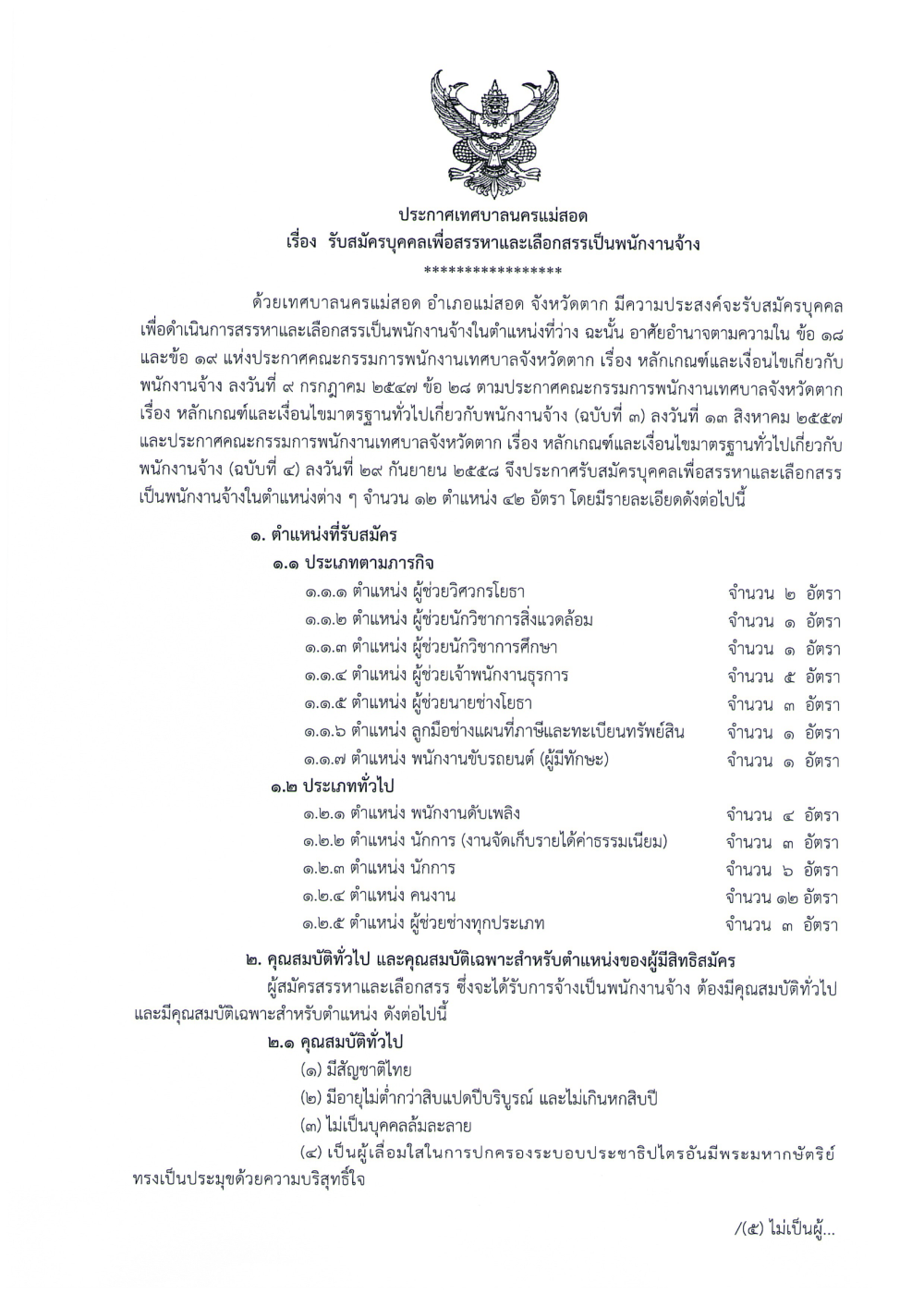 ด้วยเทศบาลนครแม่สอด อำเภอแม่สอด จังหวัดตาก มีความประสงค์จะรับสมัครบุคคลเพื่อดำเนินการสรรหาและเลือกสรรเป็นพนักงานจ้างในตำแหน่งที่ว่าง ฉะนั้นนั้น อาศัยอำนาจตามความใน ข้อ 18 และข้อ 19 แห่งประกาศคณะกรรมการพนักงานเทศบาลจังหวัดตาก เรื่อง หลักเกณฑ์และเงื่อนไขเกี่ยวกับพนักงานจ้าง ลงวันที่ 9 กรกฎาคม 2547 ข้อ 28 ตามประกาศคณะกรรมการพนักงานเทศบาลจังหวัดตาก เรื่อง หลักเกณฑ์และเงื่อนไขมาตรฐานทั่วไปเกี่ยวกับพนักงานจ้าง (ฉบับที่ 3) ลงวันที่ 13 สิงหาคม 2557 และประกาศคณะกรรมการพนักงานเทศบาลจังหวัดตาก เรื่อง หลักเกณฑ์และเงื่อนไขมาตรฐานทั่วไปเกี่ยวกับ พนักงานจ้าง (ฉบับที่ 4) ลงวันที่ 29 กันยายน 2558 จึงประกาศรับสมัครบุคคลเพื่อสรรรหาและเลือกสรรเป็นพนักงานจ้างในตำแหน่งต่าง ๆ จำนวน 12 ตำแหน่ง 42 อัตรา โดยมีรายละเอียดดังต่อไปนี้