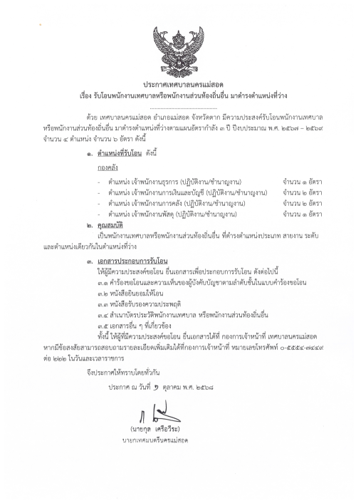 เทศบาลนครแม่สอด รับโอนพนักงานเทศบาล หรือ พนักงานส่วนท้องถิ่นอื่น มาดำรงตำแหน่งที่ว่าง