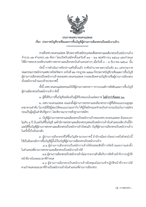 ประกาศเทศบาลนครแม่สอด เรื่อง ประกาศบัญชีรายชื่อและการขึ้นบัญชีผู้ผ่านการเลือกสรรเป็นพนักงานจ้าง