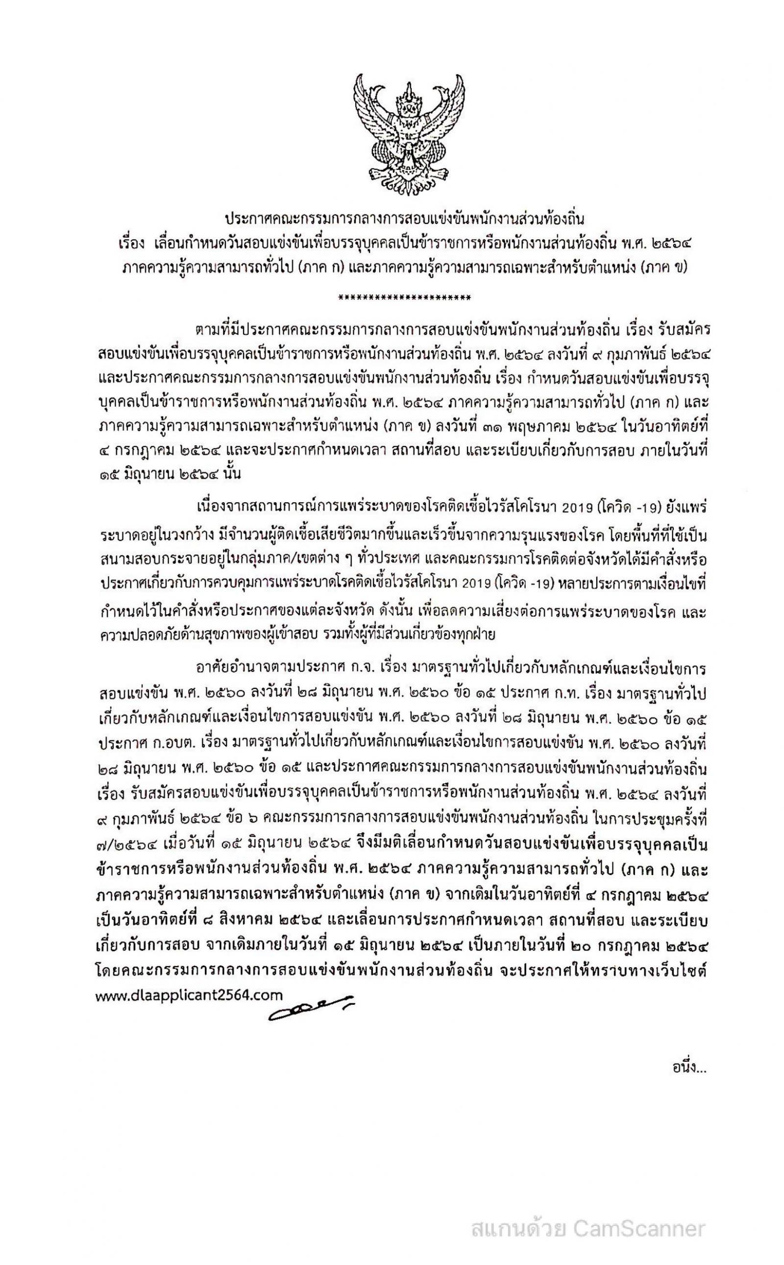 ประกาศคณะกรรมการกลางการสอบแข่งขันพนักงานส่วนท้องถิ่น เรื่อง เลื่อนกำหนดวันสอบแข่งขันเพื่อบรรจุบุคคลเป็นข้าราชการหรือพนักงานส่วนท้องถิ่น พ.ศ. 2564 ภาคความรู้ความสามารถทั่วไป (ภาค ก) และภาคความรู้ความสามารถเฉพาะสำหรับตำแหน่ง (ภาค ข)