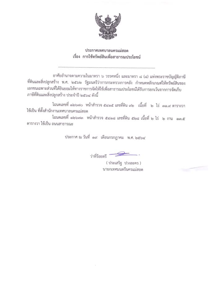 ประกาศเทศบาลนครแม่สอด เรื่อง การขยายระยะเวลาดำเนินการตามพระราชบัญญัติที่ดินและสิ่งปลูกสร้าง พ.ศ. 2562 ประจำปี พ.ศ. 2569