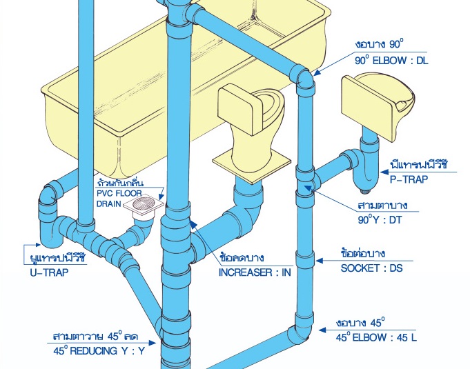 2.ระบบท่อระบายน้ำทิ้ง เป็นระบบท่อนำน้ำทิ้งจากกิจกรรมต่าง ๆ เช่น อ่างล้างหน้า น้ำทิ้งจากการอาบน้ำ หรือน้ำทิ้งจากอ่างล้างจาน ไปสู่ระบบบำบัดน้ำเสีย
