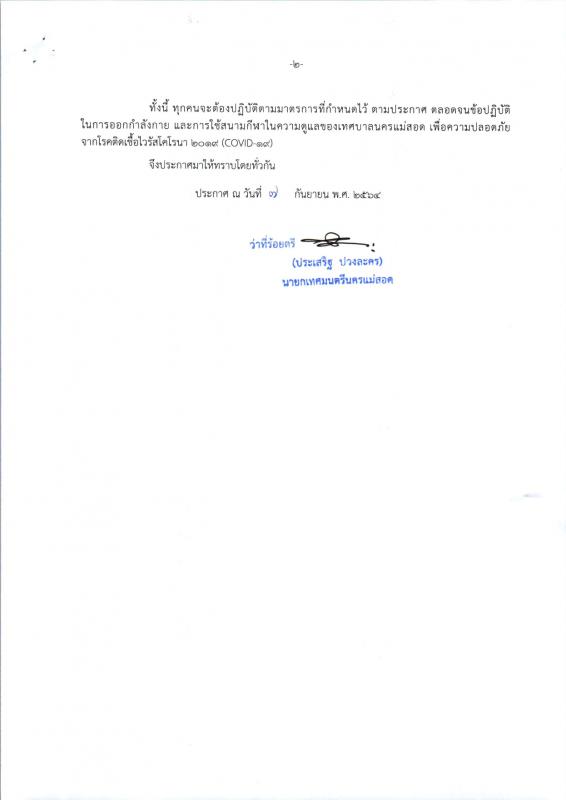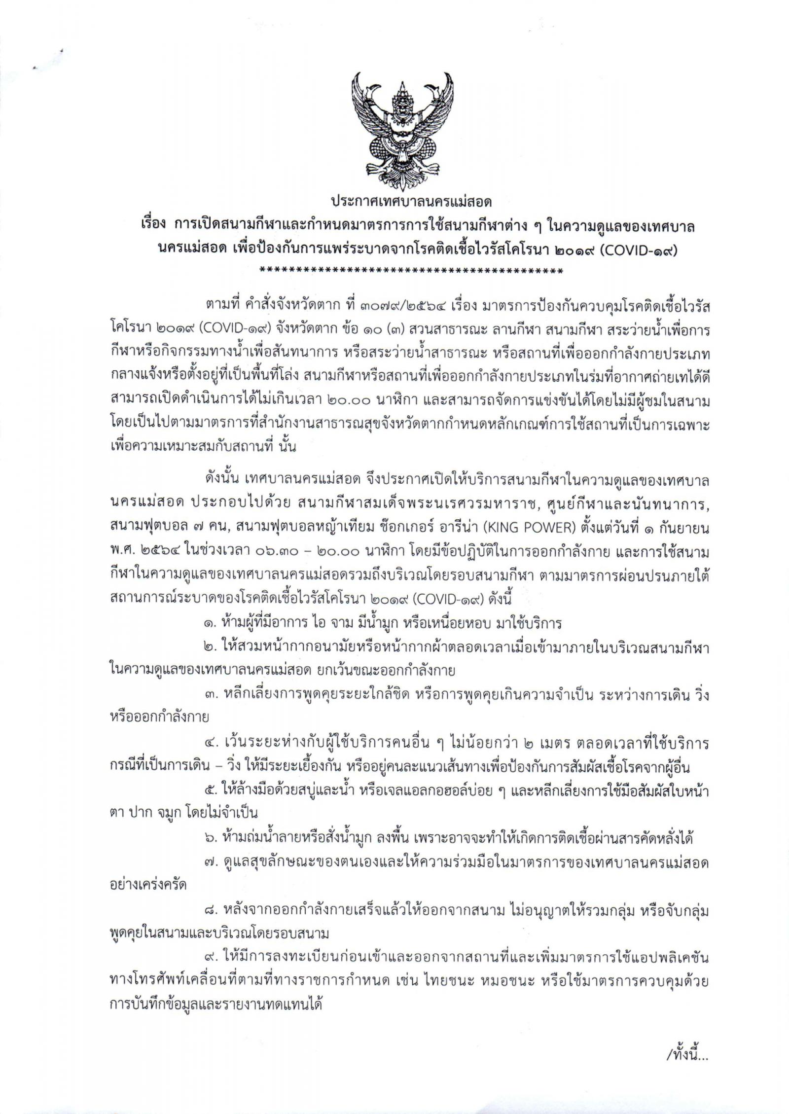 ประกาศเทศบาลนครแม่สอด เรื่องการเปิดใช้สนามกีฬาและกำหนดมาตรการต่างๆในความดูแลของเทศบาลนครแม่สอด เพื่อป้องกันการแพร่ระบาดจากโรคติดเชื้อไวรัสโคโรนา 2019 (Covid-19)