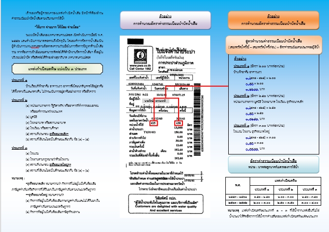 ( เลขมาตรวัดน้ำครั้งนี้ – เลขมาตรวัดน้ำครั้งก่อน ) × อัตราค่าธรรมเนียมตามประเภทของผู้ใช้น้ำ