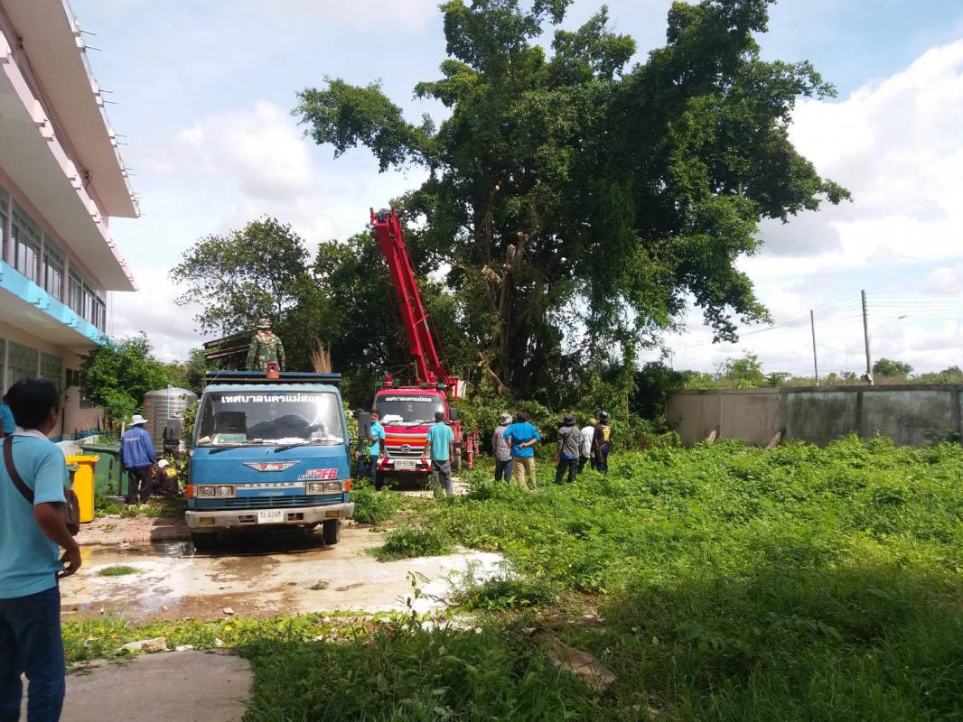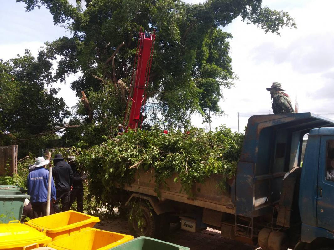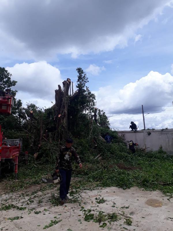 กองช่างร่วมกับงานป้องกันฯ ตัดแต่งกิ่งไม้บริเวณ รร.เทศบาลวัดมณีไพรสณฑ์