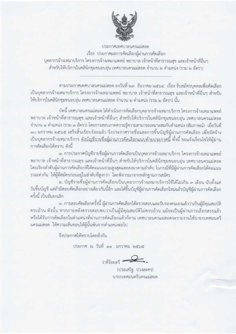 ประกาศเทศบาลนครแม่สอด เรื่อง ประกาศผลการคัดเลือกเป็นบุคลากรจ้างเหมาบริการ โครงการจ้างเหมาแพทย์ พยาบาล เจ้าหน้าที่สาธารณสุข และเจ้าหน้าที่อื่นๆ สำหรับให้บริการในคลินิกชุมชนอบอุ่น เทศบาลนครแม่สอด จำนวน 2 ตำแหน่ง (รวม 2 อัตรา)
