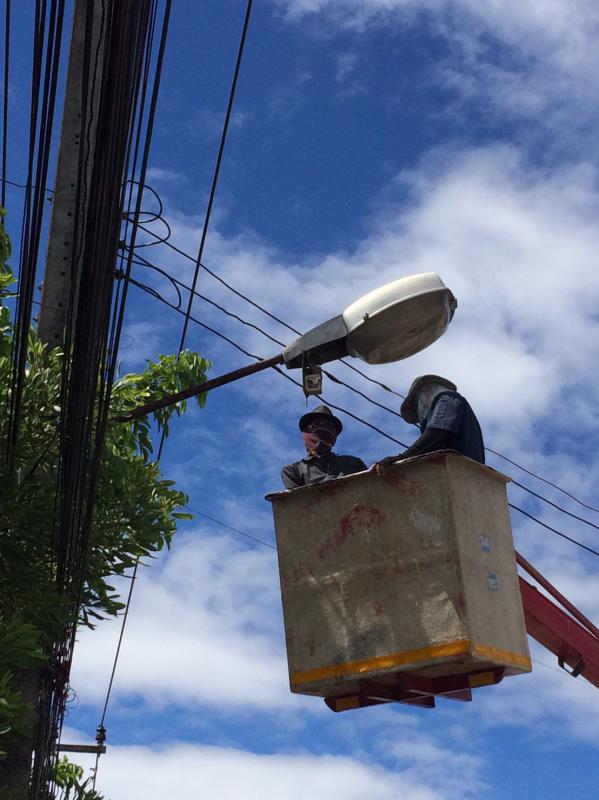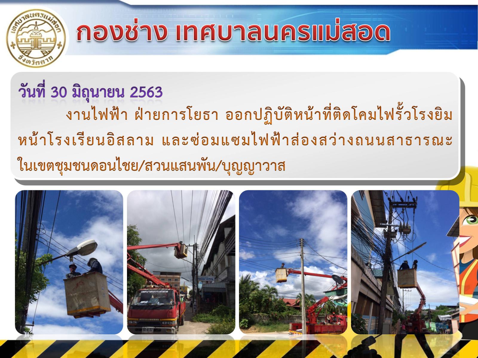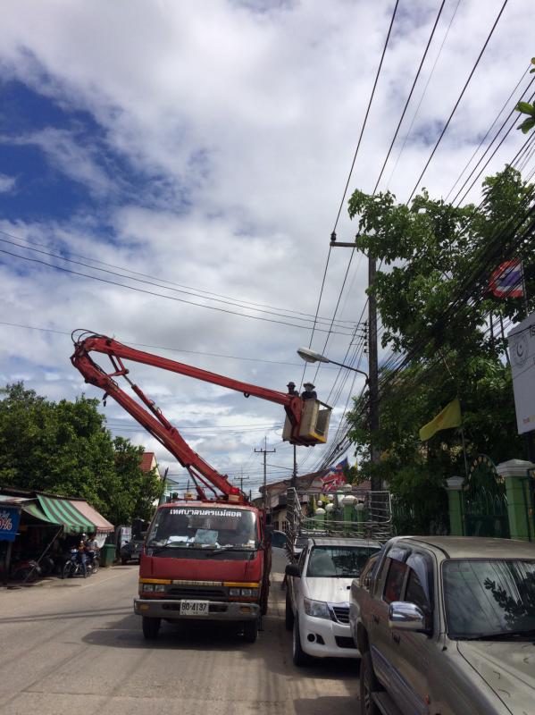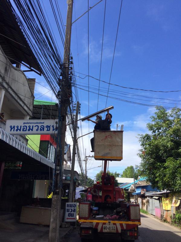 งานไฟฟ้า ฝ่ายการโยธา ออกปฏิบัติหน้าที่ติดโคมไฟและซ่อมแซมไฟฟ้าส่องสว่างถนนสาธารณะในเขตชุมชนต่าง ๆ