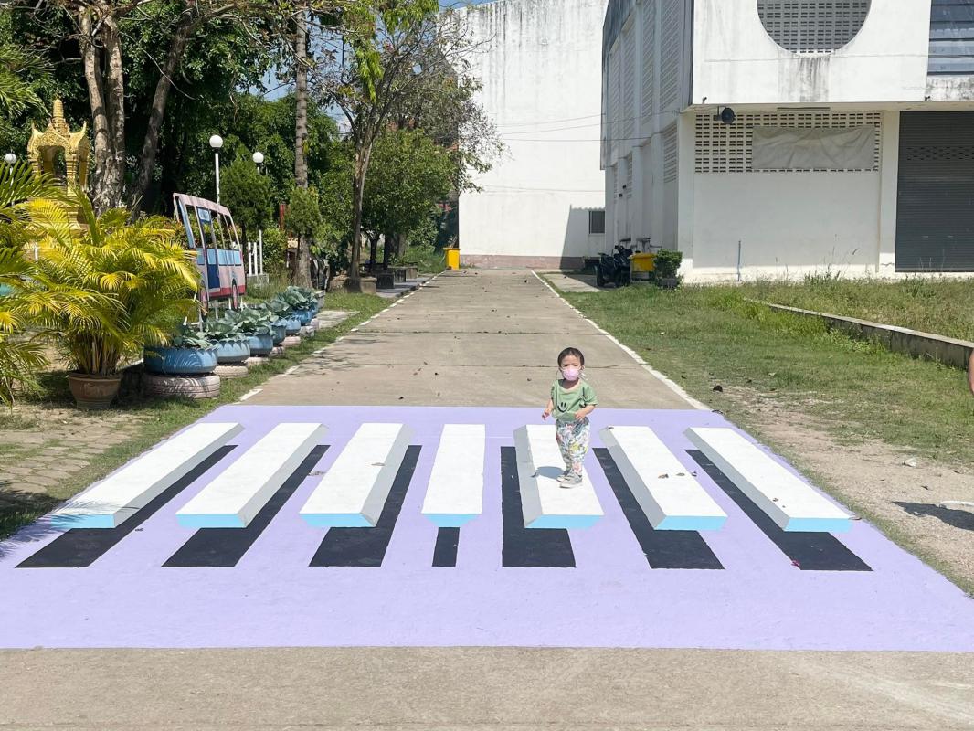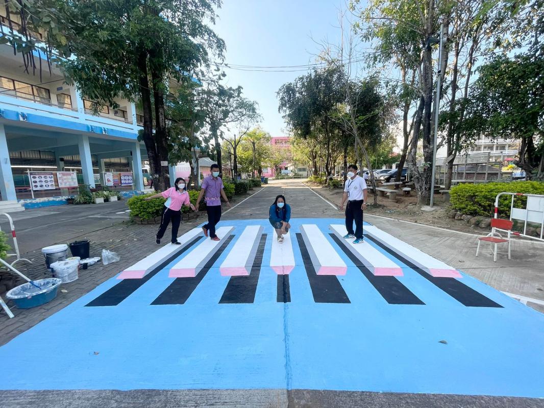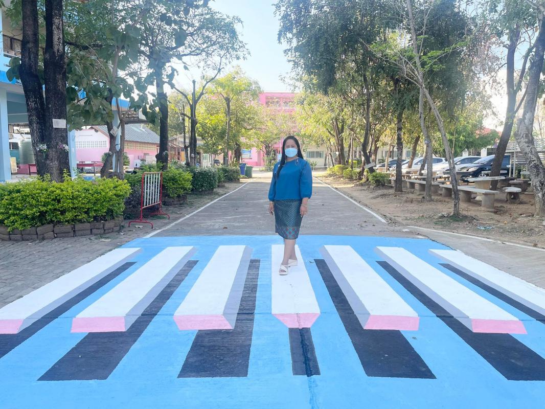 นางวาสนา เบ้านี รักษาการผู้อำนวยการสถานศึกษา โรงเรียนเทศบาลวัดดอนแก้ว พร้อมด้วยคณะครูและบุคลากรภายในสถานศึกษา ร่วมดำเนินการจัดทำทางม้าลาย 3 มิติ เพื่อเป็นแหล่งเรียนรู้เกี่ยวกับกฎหมายจราจร และการป้องกันตนเองในการข้ามถนนภายในสถานศึกษา