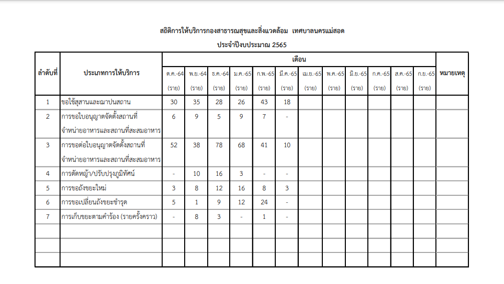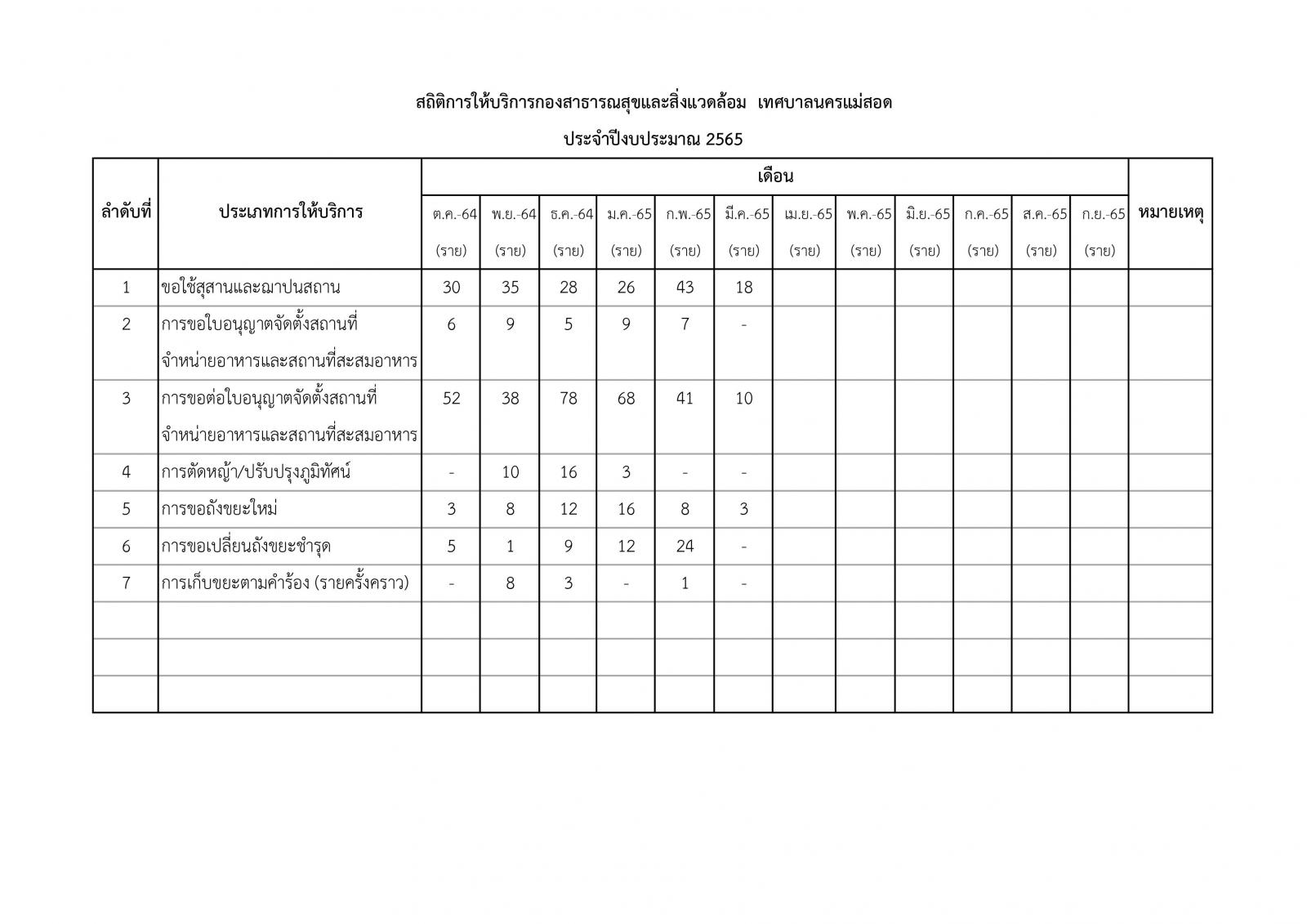 สถิติการให้บริการแก่ประชาชน และผู้ที่มาติดต่อประสานงาน ของกองสาธารณสุขและสิ่งแวดล้อม เทศบาลนครแม่สอด ประจำปีงบประมาณ 2565