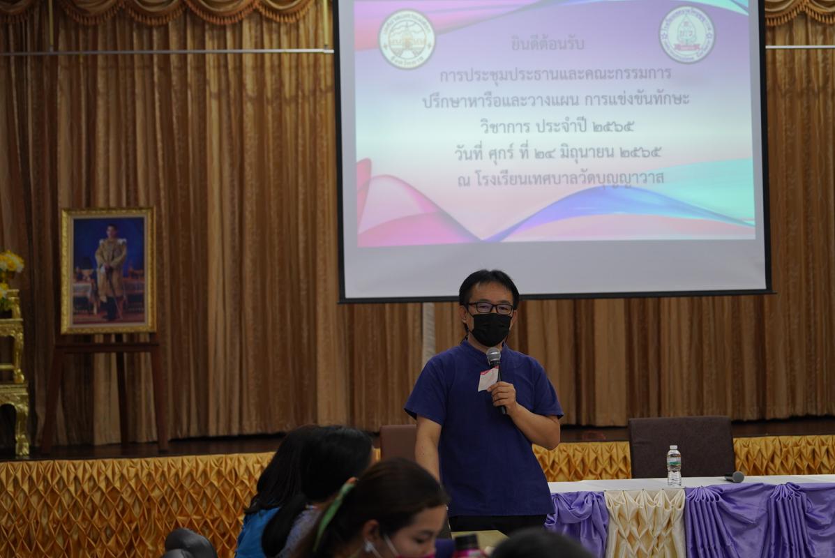 วันที่ 24 มิถุนายน 2565 เวลา 15.30 น. ณ ห้องประชุมคณะกรรมการสถานศึกษา โรงเรียนเทศบาลวัดบุญญาวาส ว่าที่ร้อยตรีประเสริฐ ปวงละคร นายกเทศมนตรีนครแม่สอด มอบหมายให้นายกรณพงศ์ คงปาน รองนายกเทศมนตรีนครแม่สอด เป็นประธานในการประชุมคณะกรรมการดำเนินงานการประกวดแข่งขันทักษะทางวิชาการ ประจำปีการศึกษา 2565 (ชุดที่ 2) โดยมีนายพีระ วงค์หมอ ผู้อำนวยการกองการศึกษา นางสาวชมพูนุช ปันทิ ผู้อำนวยการสถานศึกษา โรงเรียนเทศบาลวัดบุญญาวาส พร้อมคณะครูให้การต้อนรับและเข้าร่วมการประชุมในครั้งนี้