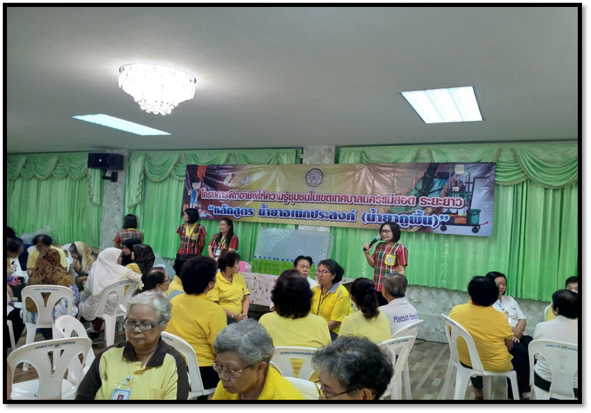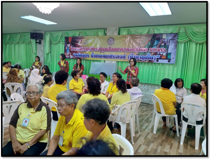เทศบาลนครแม่สอด ได้ดำเนินการจัดทำโครงการฝึกอาชีพให้ความรู้ชุมชนในเขตเทศบาลนครแม่สอด ระยะยาว ประจำปีงบประมาณ 2562 “หลักสูตร น้ำยาอเนกประสงค์ (น้ำยาถูพื้น)” ในวันที่ 27 มิถุนายน 2562 ณ ห้องประชุมเพชรภูมิปัญญา เทศบาลนครแม่สอด โดยมีประชาชน ในเขตเทศบาลนครแม่สอด และบุคลากร ที่เกี่ยวข้องเข้าร่วมโครงการ