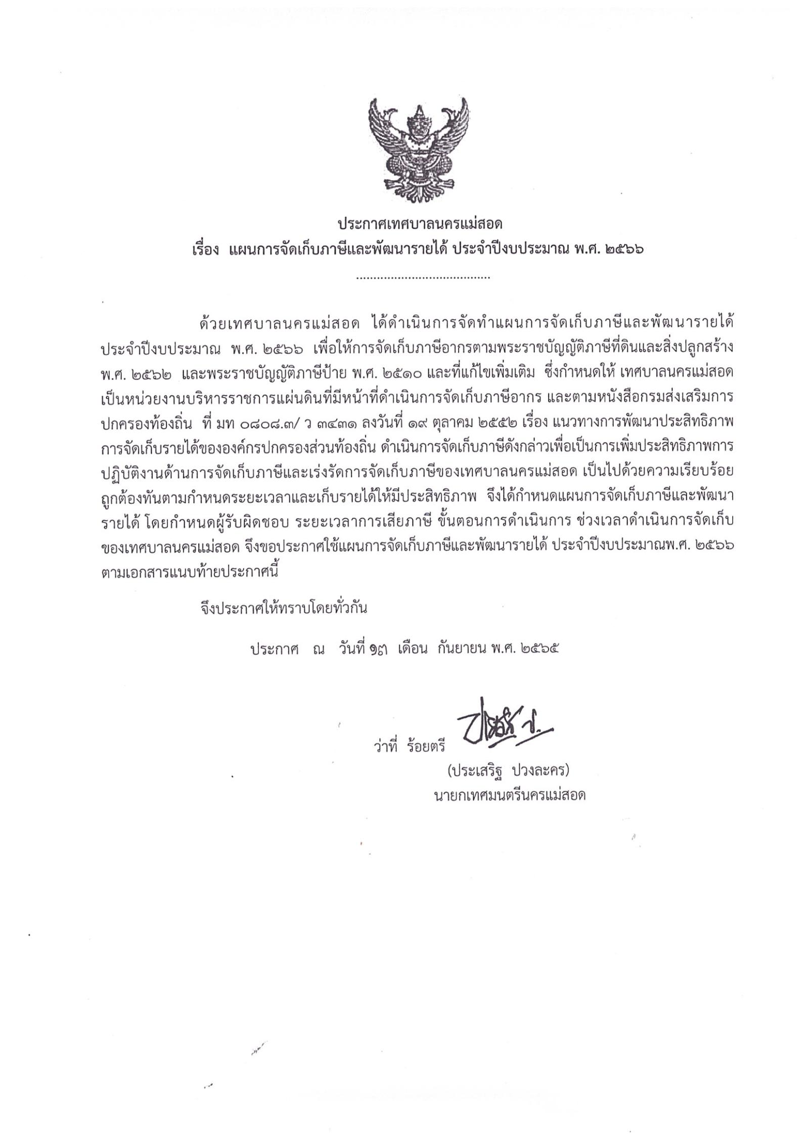 ประกาศเทศบาลนครแม่สอด เรื่อง แผนการจัดเก็บภาษีและพัฒนารายได้ ประจำปีงบประมาณ พ.ศ. 2566