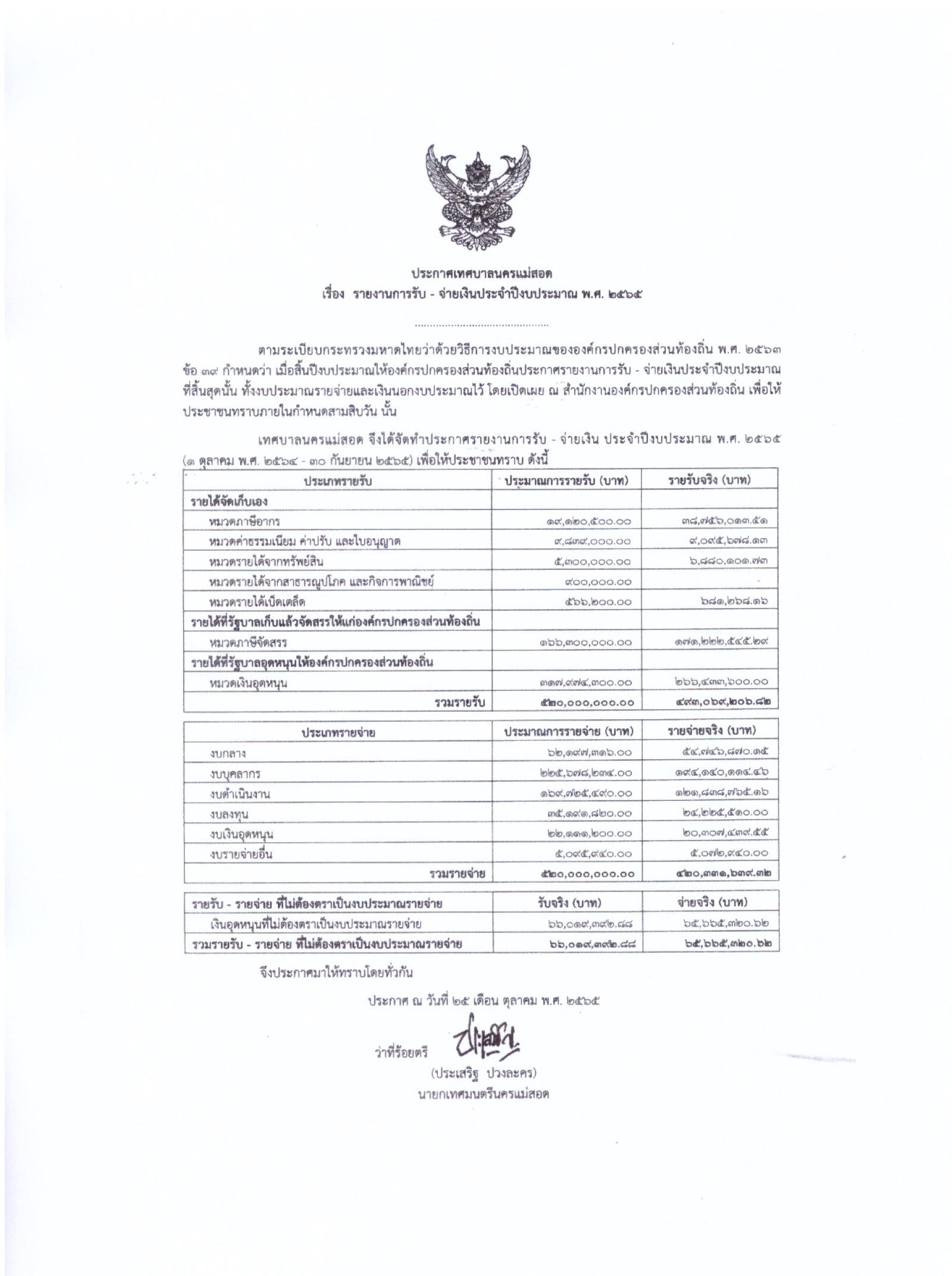 เทศบาลนครแม่สอด จึงได้จัดทำประกาศรายงานการรับ - จ่ายเงิน ประจำปีงบประมาณ พ.ศ. 2565 (1 ตุลาคม พ.ศ. 2564 - 30 กันยายน 2565) เพื่อให้ประชาชนทราบ ดังนี้