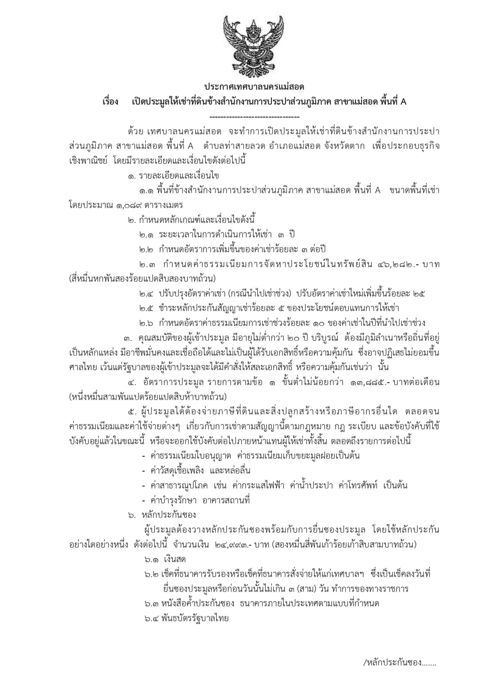 ประกาศเทศบาลนครแม่สอด เรื่อง เปิดประมูลให้เช่าที่ดินข้างสำนักงานการประปาส่วนภูมิภาค สาขาแม่สอด พื้นที่ A