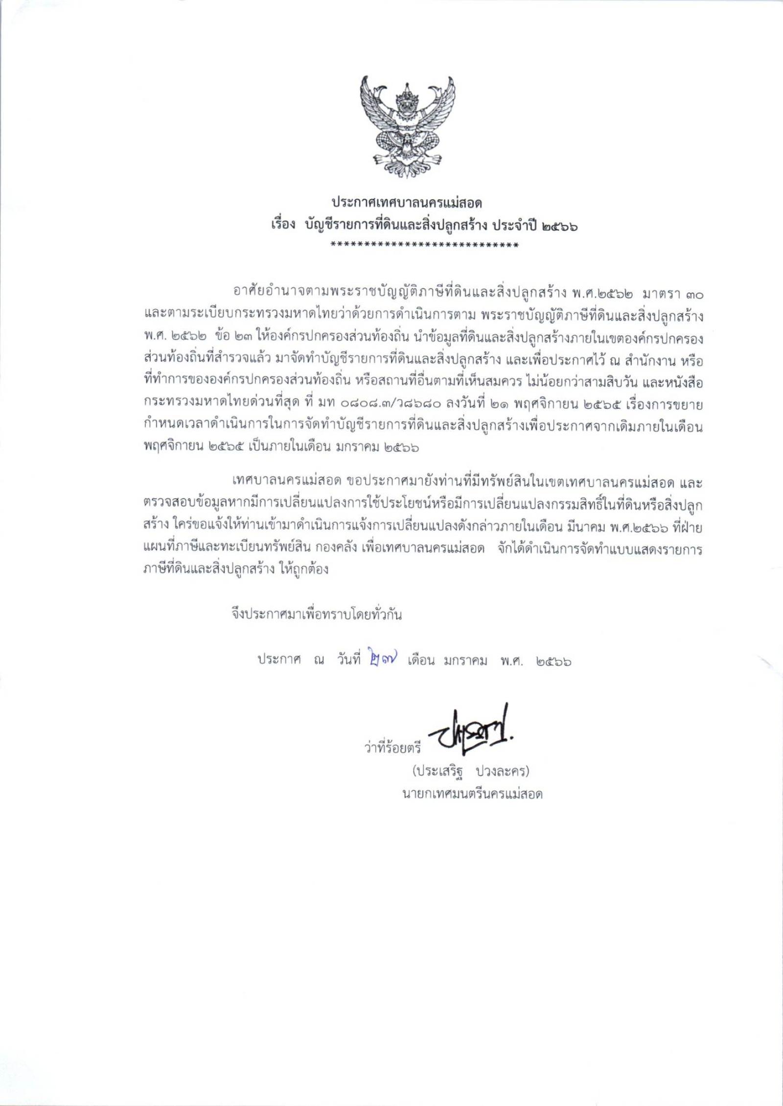 ประกาศเทศบาลนครแม่สอด เรื่อง บัญชีรายการที่ดินและสิ่งปลูกสร้าง ประจำปี 2566