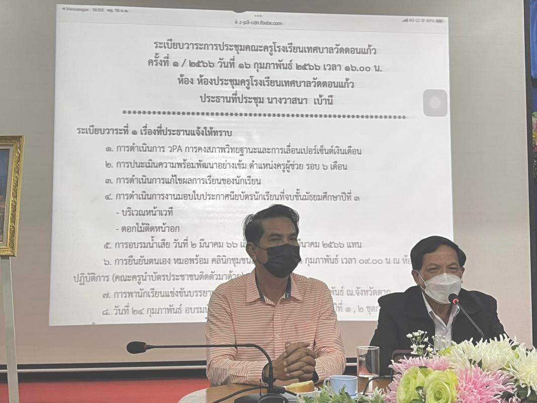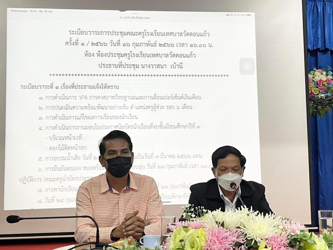 วันที่ 16 กุมภาพันธ์ 2566 เวลา 16.00 น. ณ ห้องประชุมโรงเรียนเทศบาลวัดดอนแก้ว อำเภอแม่สอด จังหวัดตาก โรงเรียนเทศบาลวัดดอนแก้วจัดประชุมประจำเดือนกุมภาพันธ์ โดยมีท่านรองนายกเทศมนตรีนครแม่สอด ท่านรองกันณพงศ์ คงปาน พร้อมด้วยผู้อำนวยการกองการศึกษาเทศบาลนครแม่สอด ท่านพีระ วงศ์หมอ ได้ให้เกียรติมาเข้าน่วมการประชุมกับคณะครู โดยข้อราชการ ข้อควรปฏิบัติ ข้อควรระวัง ภายในสถานศึกษา