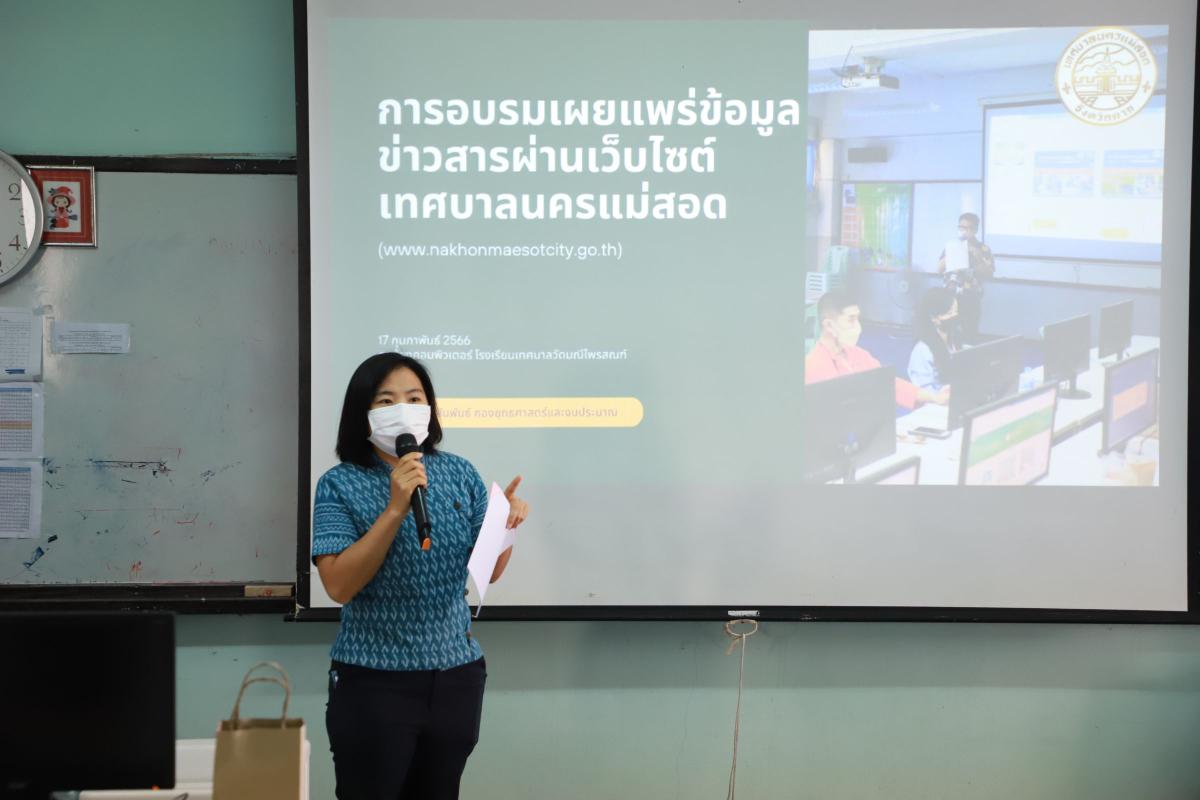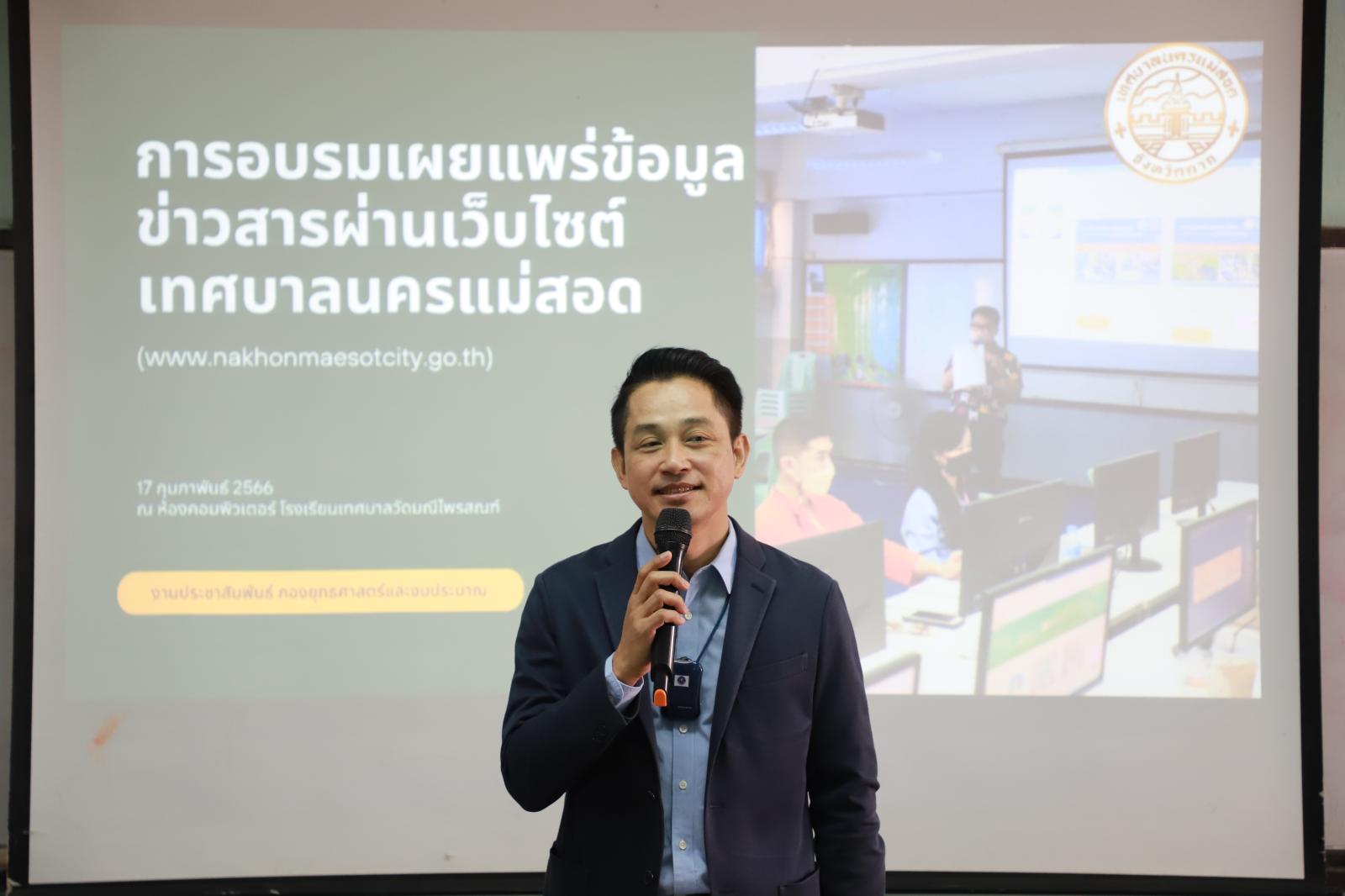ว่าที่พันตรี ไพฑูรย์ ปริญญาธรรมกุล ผู้อำนวยการกองยุทธศาสตร์และงบประมาณ เป็นประธานเปิดการอบรม พร้อมด้วยพร้อมด้วยนางสาวศิริวรรณ แก้วฟู นักประชาสัมพันธ์ปฏิบัติการ รักษาราชการแทนหัวหน้าฝ่ายวิเทศสัมพันธ์ ข้าราชการและพนักงานเจ้าที่ที่เกี่ยวข้องฝ่ายวิเทศสัมพันธ์ กองยุทธศาสตร์และงบประมาณ จัดอบรมการเผยแพร่ข้อมูลข่าวสารผ่านทางเว็บไซต์เทศบาลนครแม่สอด เพื่อให้การเผยแพร่ประชาสัมพันธ์ข้อมูลข่าวสารต่อสาธารณะผ่านเว็บไซต์เทศบาลนครแม่สอดเป็นไปอย่างมีประสิทธิภาพ รวดเร็ว ถูกต้อง เกิดประโยชน์สูงสุดและทันต่อเหตุการในปัจจุบัน โดยมีข้าราชการพนักงาน และเจ้าหน้าที่ผู้ปฏิบัติหน้าที่ประชาสัมพันธ์ข้อมูลข่าวสารประจำแต่ละกอง เข้าร่วมการอบรมในครั้งนี้