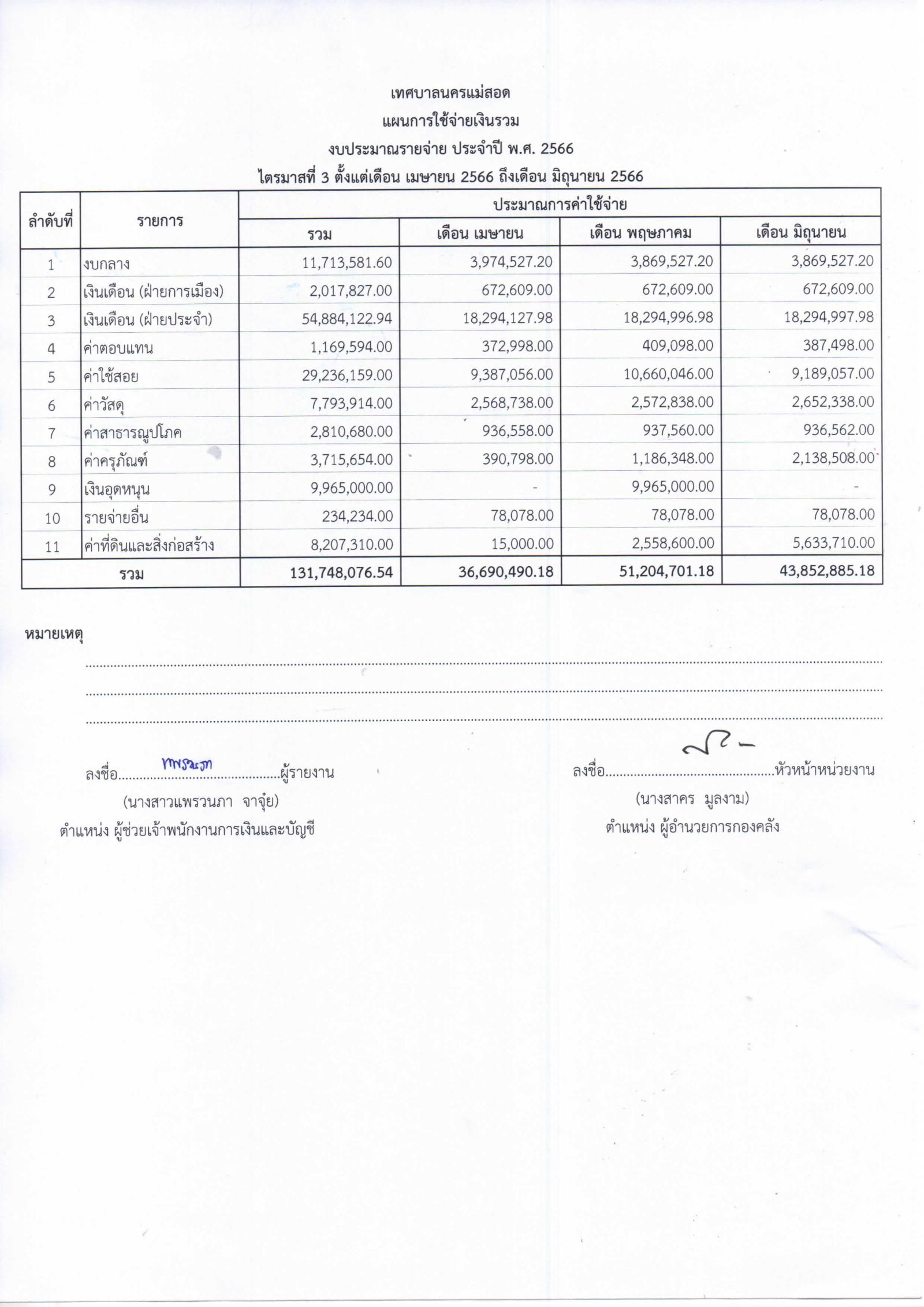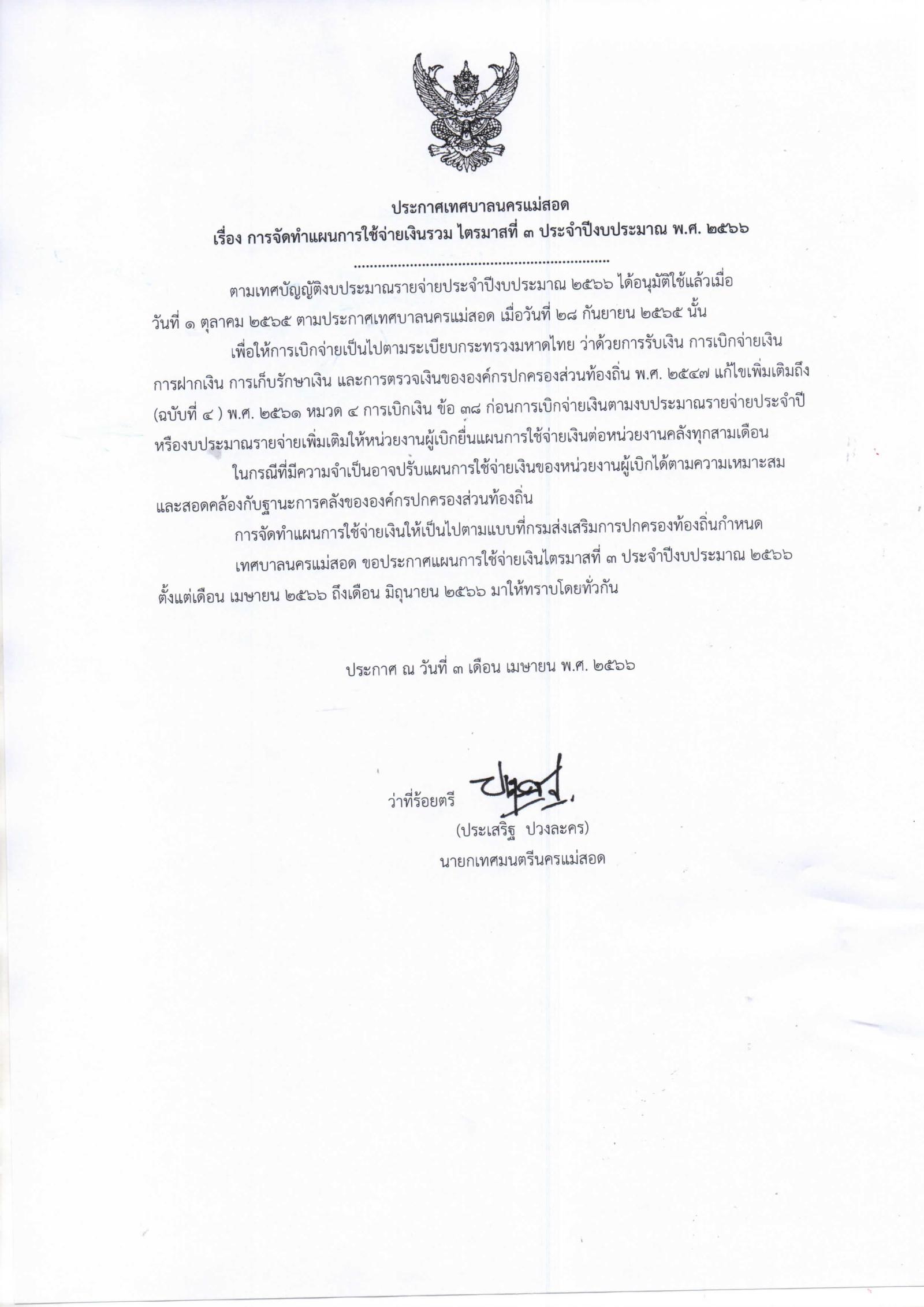 ประกาศเทศบาลนครแม่สอด เรื่อง การจัดทำแผนการใช้จ่ายเงินรวม ไตรมาสที่ 3 ประจำปีงบประมาณ พ.ศ. 2566
