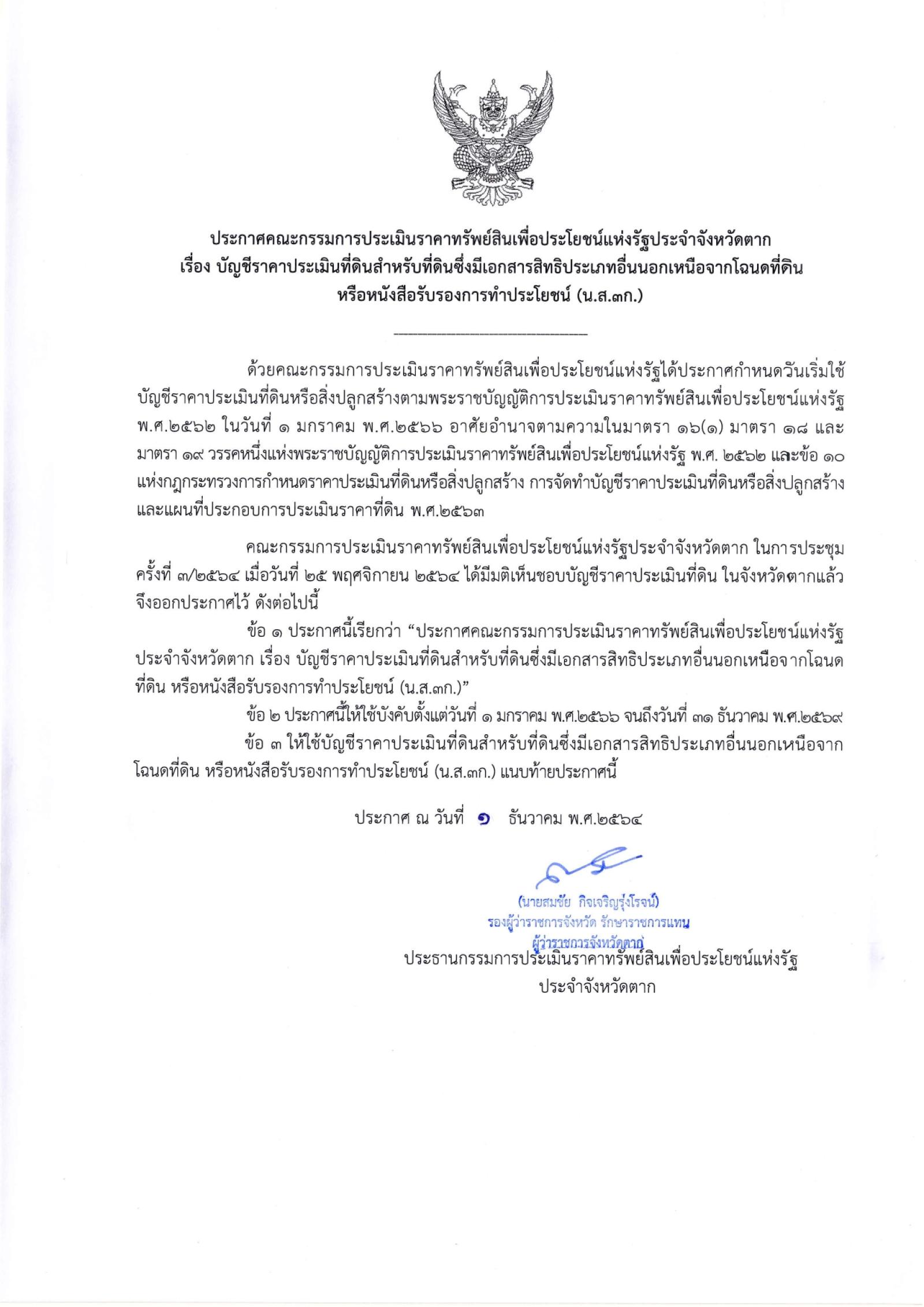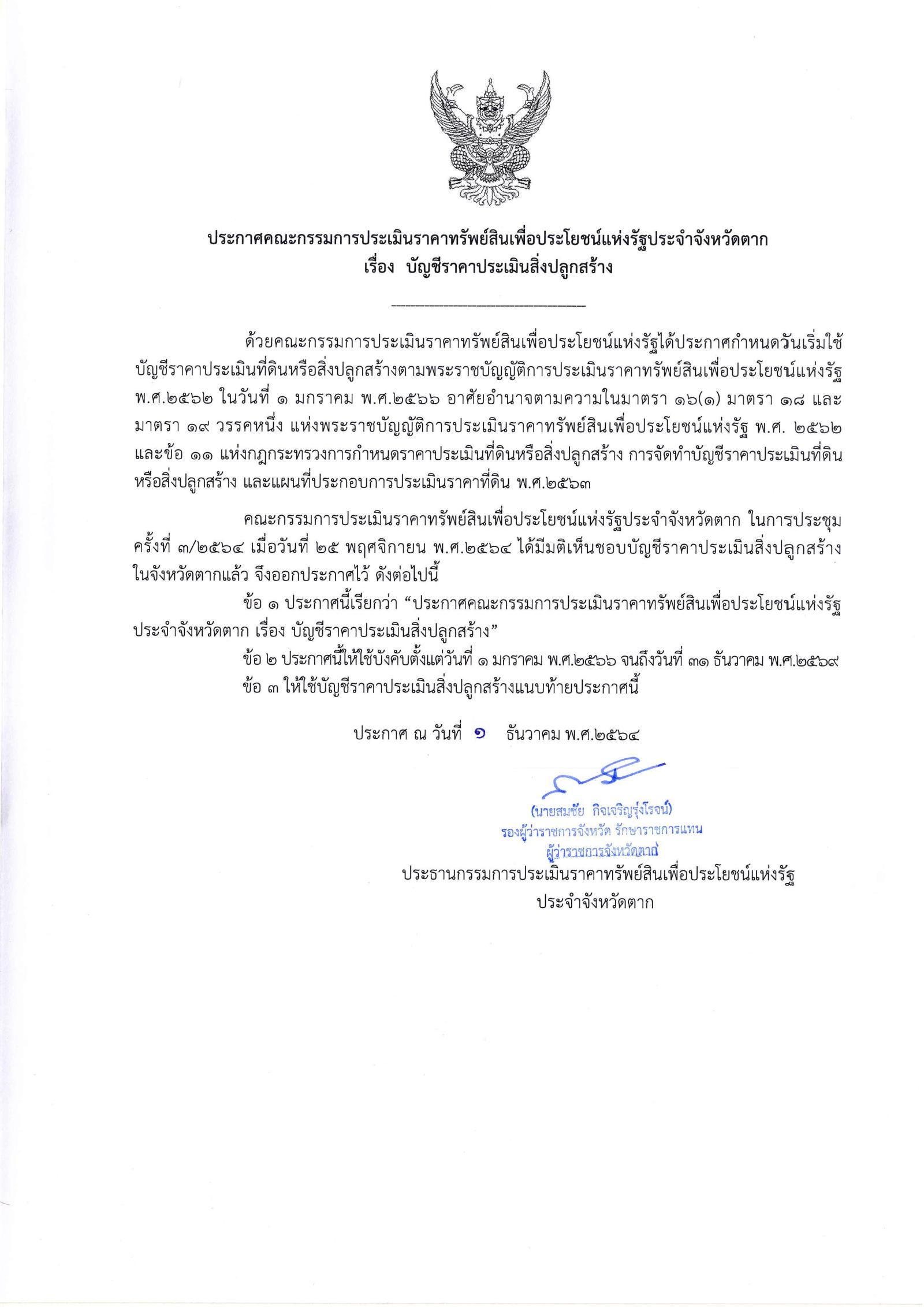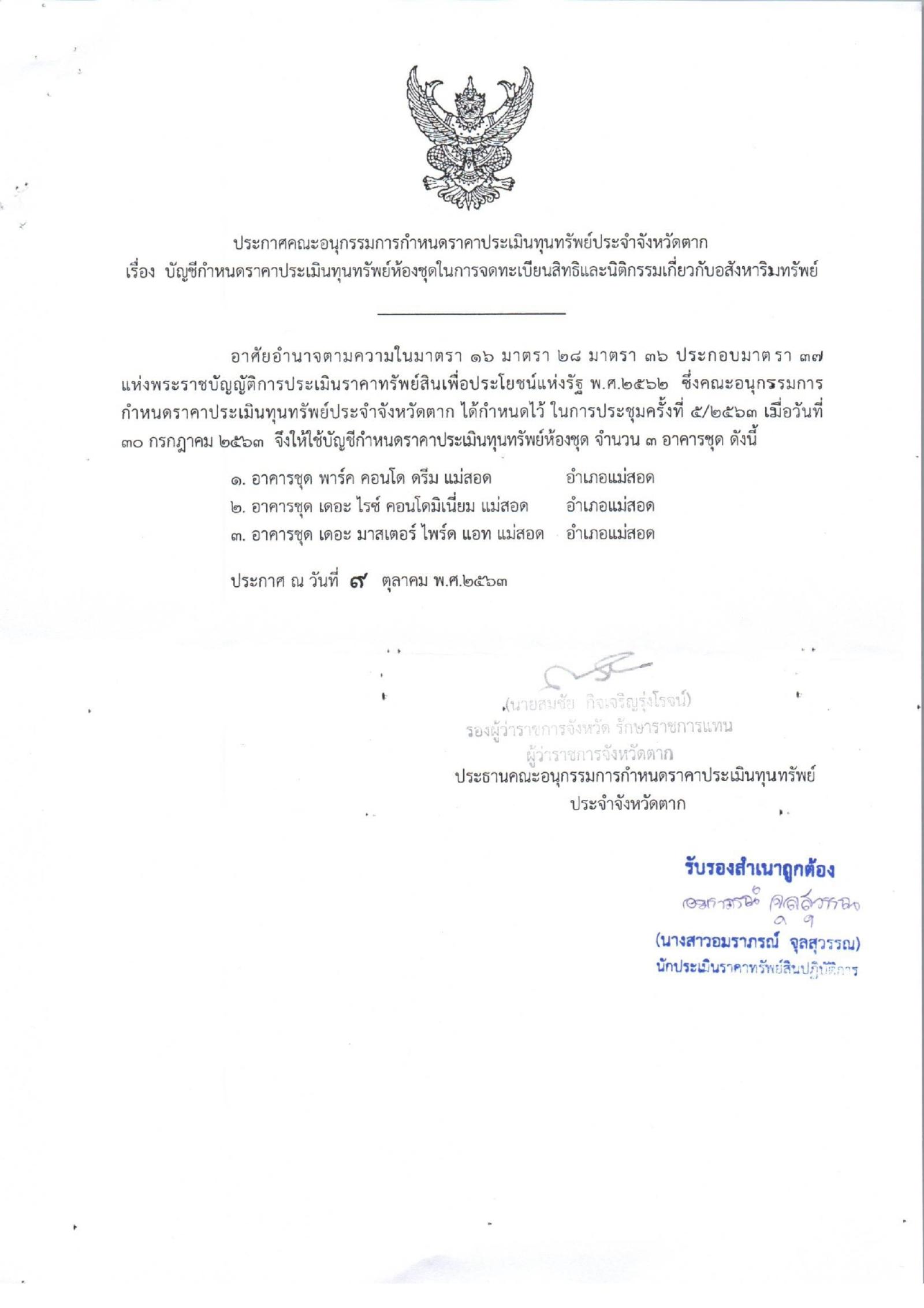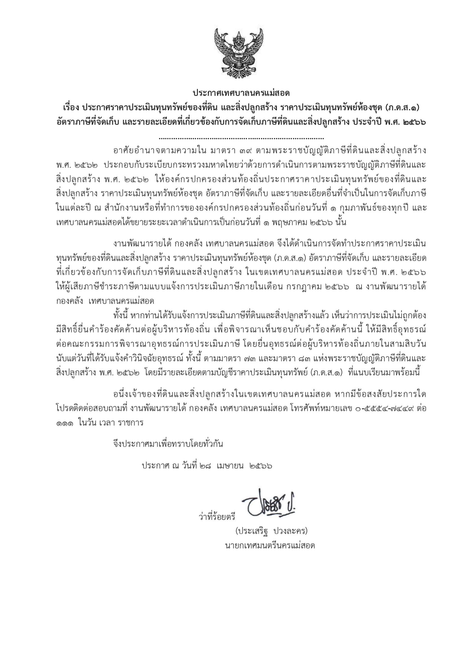 ประกาศเทศบาลนครแม่สอด เรื่อง ประกาศราคาประเมินทุนทรัพย์ของที่ดิน และสิ่งปลูกสร้าง ราคาประเมินทุนทรัพย์ห้องชุด (ภ.ด.ส. 1) อัตราภาษีที่จัดเก็บ และรายละเอียดที่เกี่ยวข้องกับการจัดเก็บภาษีที่ดินและสิ่งปลูกสร้าง ประจำปี พ.ศ. 2566