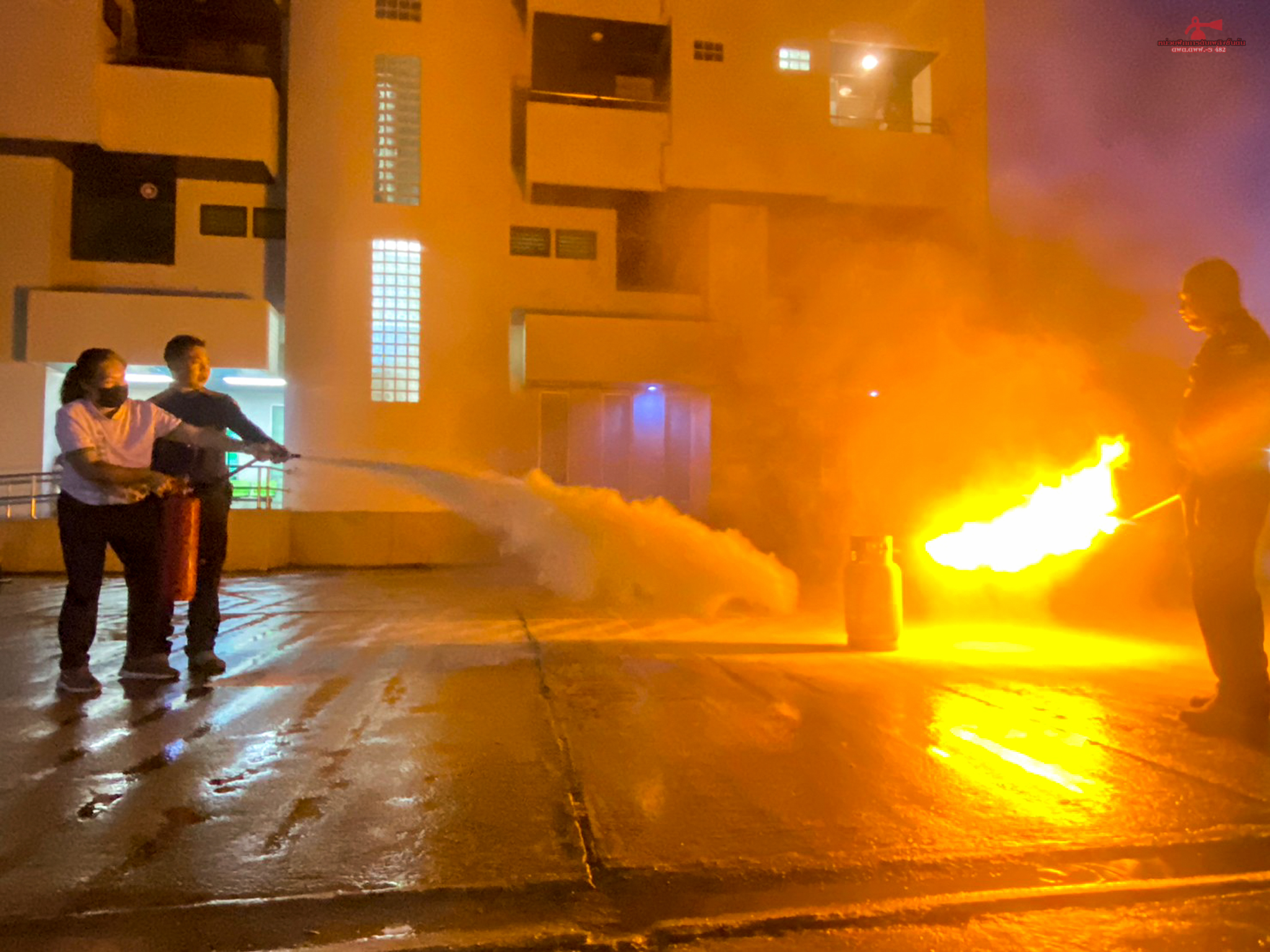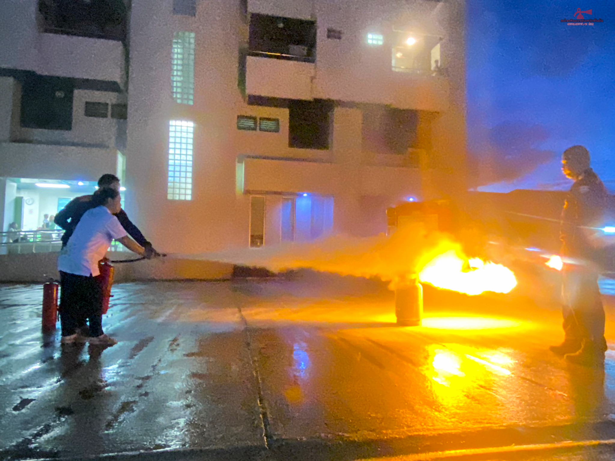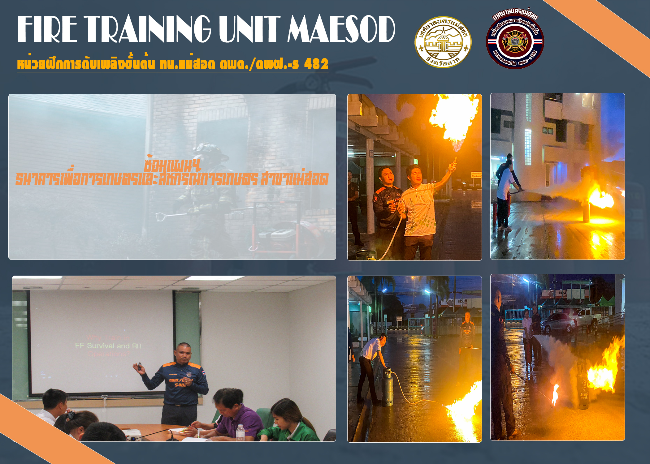 วันที่ 11 กรกฎาคม 2566 เวลา 16.00 - 21.00 น. เจ้าหน้าที่หน่วยฝึก ดพต./ดพฝ.-ร482 ออกฝึกอบรม เรื่อง การดับเพลิงขั้นต้น การฝึกซ้อมดับเพลิง และฝึกซ้อมอพยพหนีไฟ ให้กับ ธนาคารเพื่อการเกษตรและสหกรณ์การเกษตร สาขาแม่สอด ตามโครงการอบรมเชิงปฏิบัติการเรื่องการอบรมดับเพลิงเบื้องต้น ประจำปี 2566 โดยการจัดให้มีการฝึกอบรมการป้องกันและระงับอัคคีภัย การดับเพลิงเบื้องต้นและการใช้ถังเคมีดับเพลิง โดยมีการให้ความรู้เกี่ยวกับ เรื่อง แผนการดับเพลิงและวิธีการดับเพลิงของ สถานประกอบการ ฝึกซ้อมดับเพลิง และได้ให้ความรู้เกี่ยวกับการป้องกันระงับอัคคีภัย องค์ประกอบของการเกิดไฟ ประเภทของไฟ ความรู้เกี่ยวกับสารเคมี การใช้ถังดับเพลิงเคมี พร้อมสาธิตการฝึกปฏิบัติ การใช้อุปกรณ์เครื่องมือการดับเพลิงและบรรเทาสาธารณภัย การใช้อุปกรณ์ดับเพลิงอย่างถูกวิธี เลือกใช้ ความปลอดภัย การแนะนำอุปกรณ์ชุดผจญเพลิง เป็นต้น
