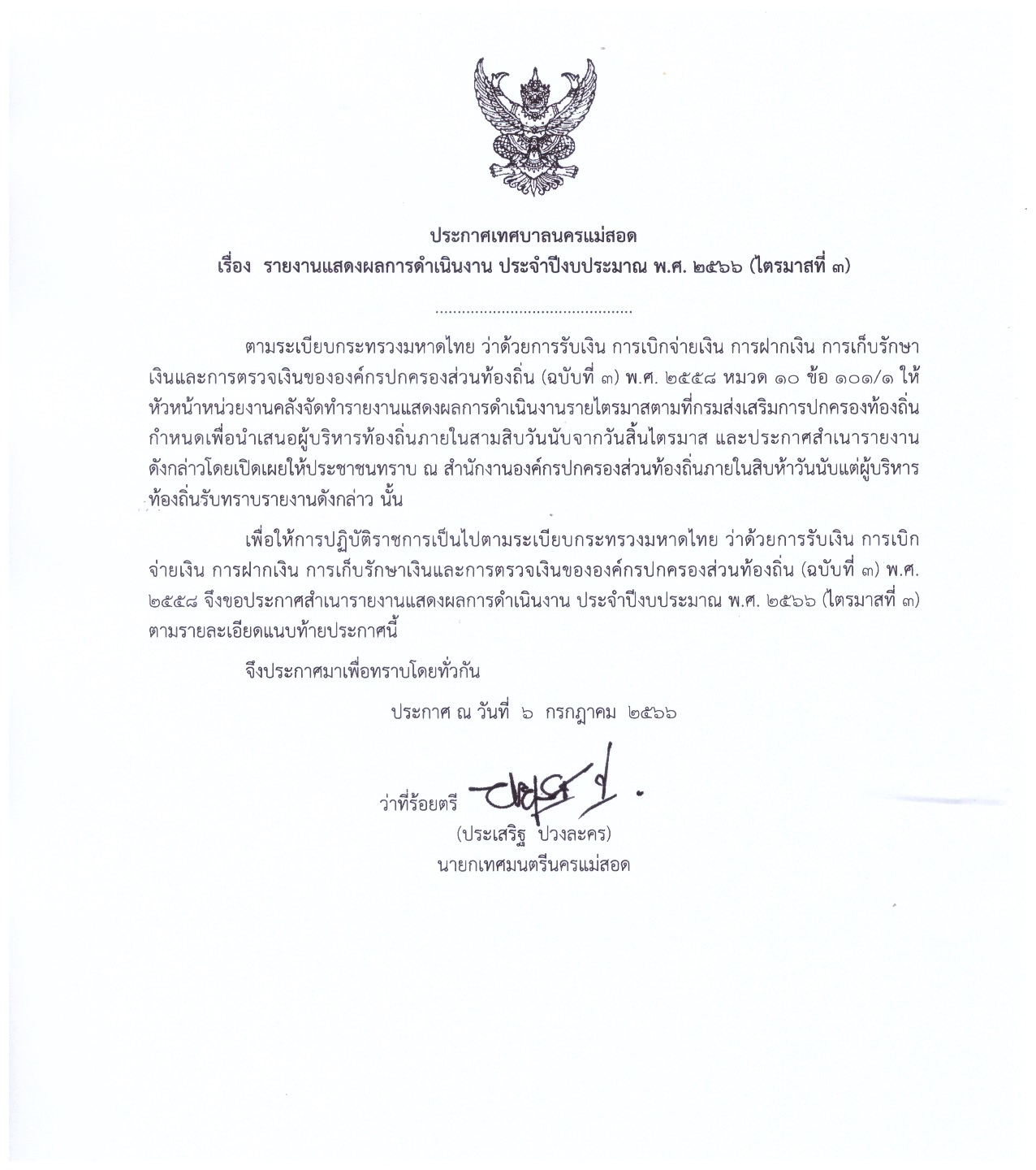 ประกาศเทศบาลนครแม่สอด เรื่อง รายงานแสดงผลการดำเนินงาน ประจำปีงบประมาณ พ.ศ.2566 ไตรมาสที่ 3.pdf