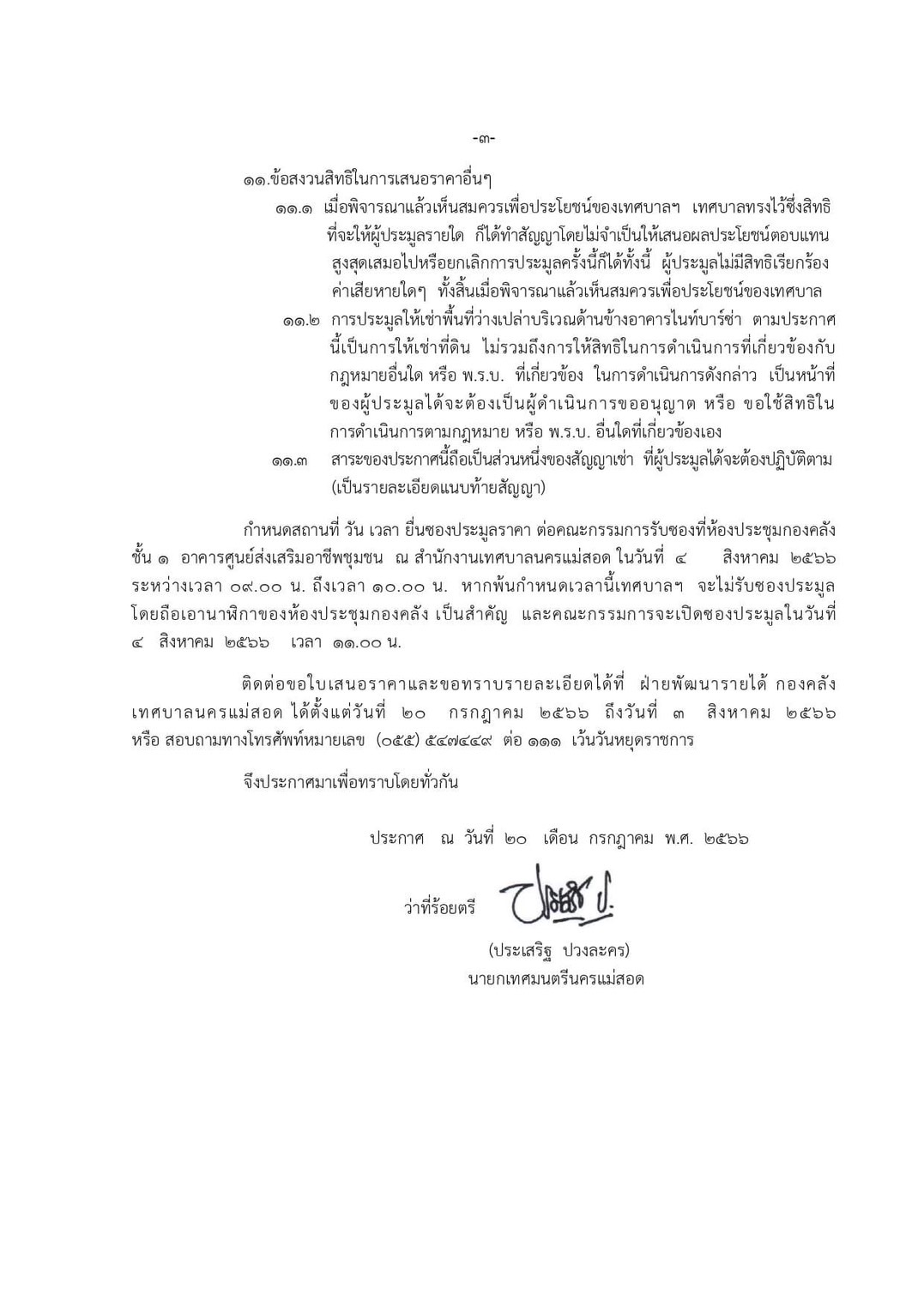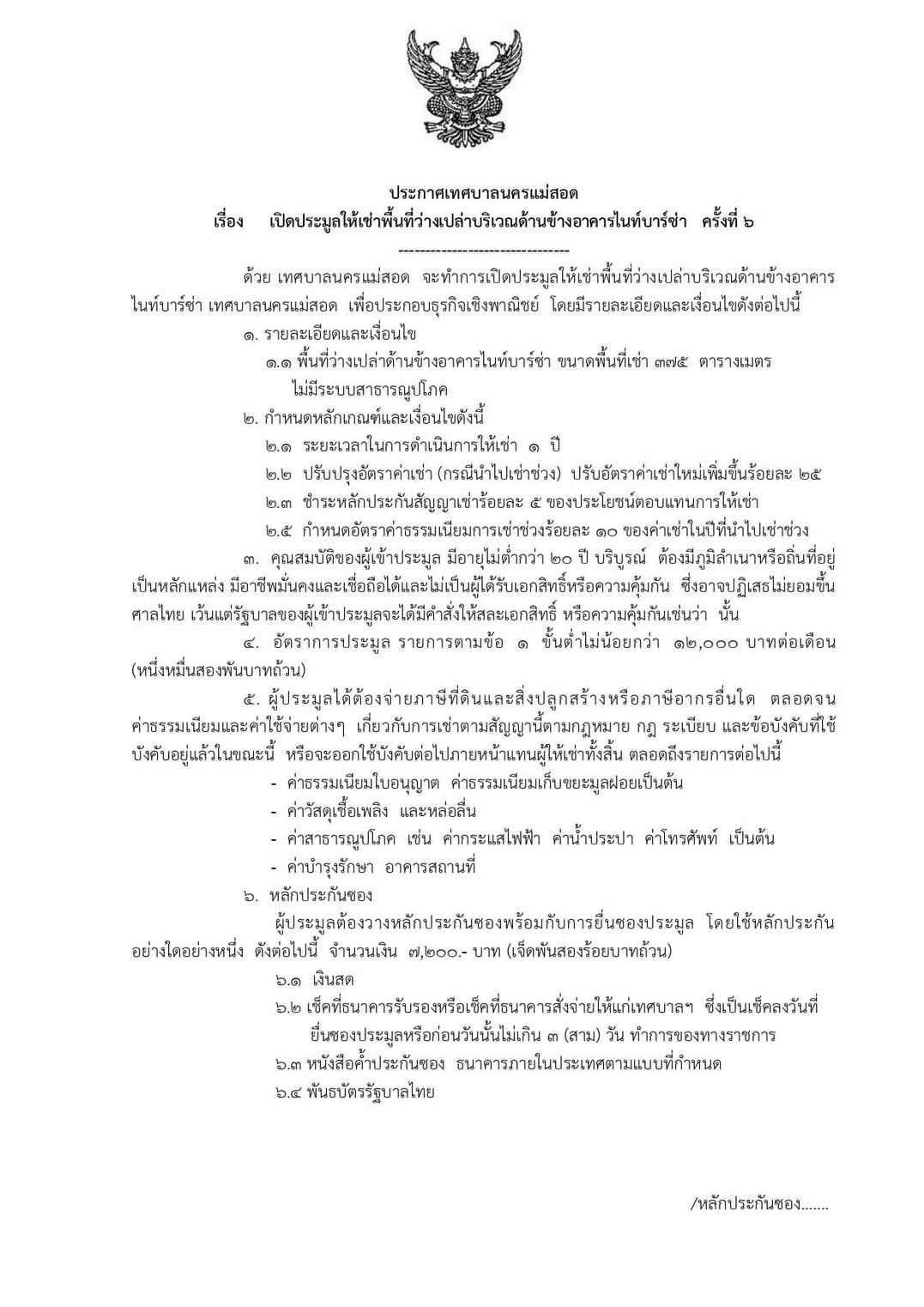 ประกาศเทศบาลนครแม่สอด เรื่อง เปิดประมูลให้เช่าพื้นที่ว่างเปล่าบริเวณด้านข้างอาคารไนท์บาร์ซ่า ครั้งที่ 6