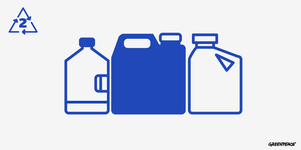 สัญลักษณ์ เบอร์ 2: โพลีเอทิลีนความหนาแน่นสูง (HDPE) บรรจุภัณฑ์พลาสติกสีขาวและสีอื่นที่เป็นสีทึบ (ให้นึกถึงพวกขวดนมสีขุ่นๆ) ขวดชนิดนี้จะเหนียวและทนทานกว่า PET ยกตัวอย่างเช่น ขวดนม ขวดแชมพู ขวดน้ำยาปรับผ้านุ่ม ผลิตภัณฑ์ซักผ้า กระปุกยา เป็นต้น สามารถสังเกตสัญลักษณ์ เบอร์ 2 และ HDPE/HD-PE