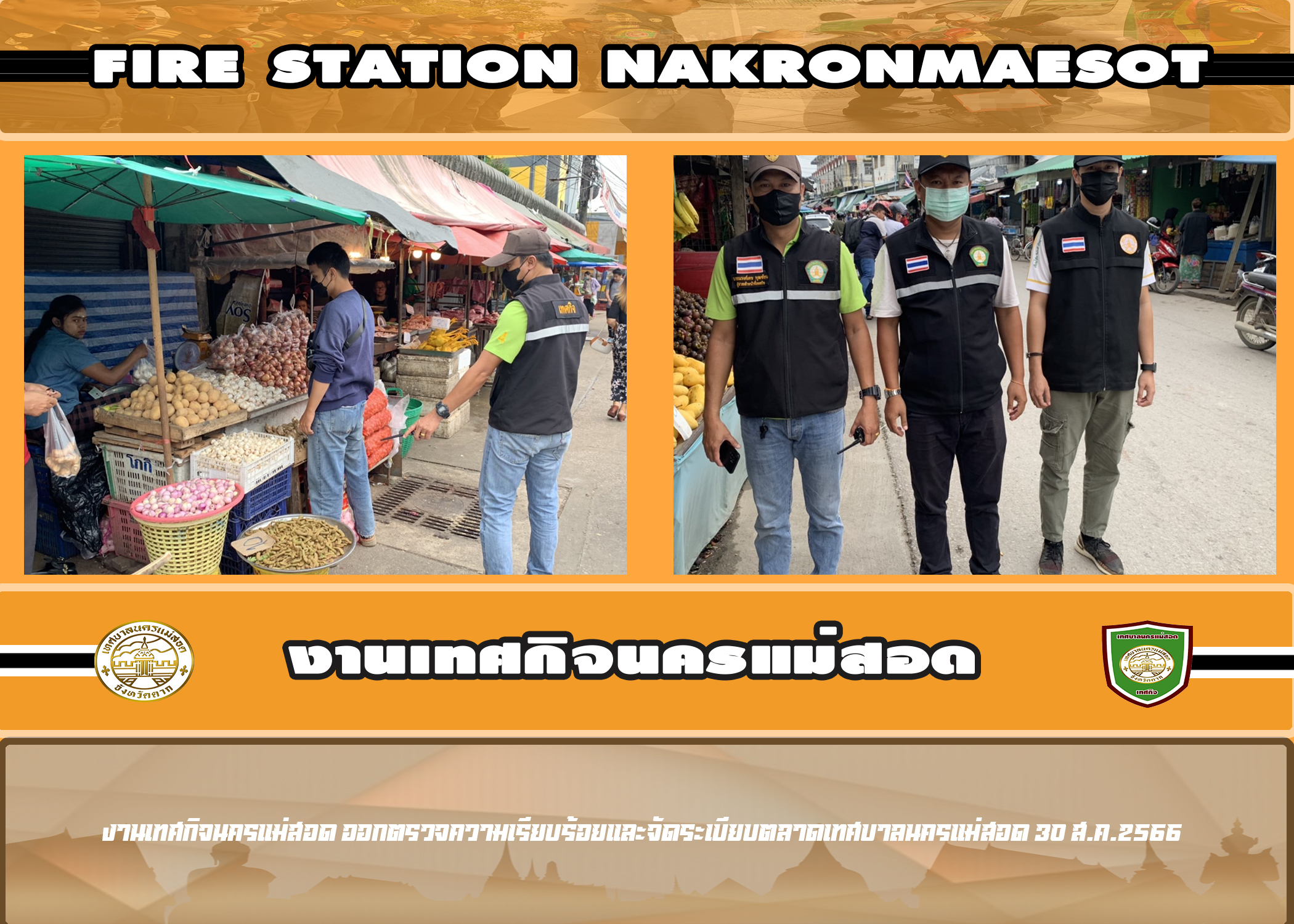 วันที่ 30 สิงหาคม 2566 เจ้าหน้าที่เทศกิจนครแม่สอด ออกปฏิบัติหน้าที่ ตรวจสอบและจัดระเบียบร้านค้าในตลาดสดภายในเขตเทศบาลนครแม่สอด(ตลาดศรีมอย ตลาดศาลพ่อต๊าว ตลาดพาเจริญ) ตาม พรบ.รักษาความสะอาดและความเป็นระเบียบเรียบร้อยของบ้านเมือง พ.ศ.2535