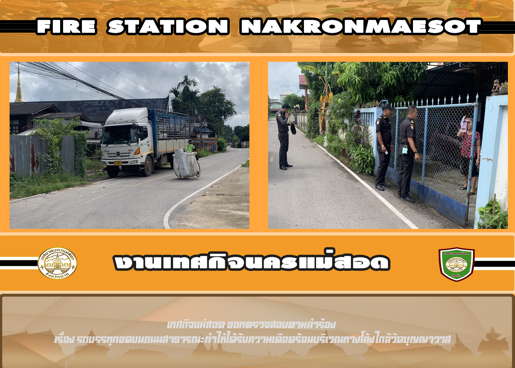 วันที่ 4 กันยายน 2566 เวลา 09.00 น. เจ้าหน้าที่เทศกิจนครแม่สอด ออกตรวจสอบข้อร้องเรียนกรณีมีการนำรถหกล้อมาจอดบนถนนสาธารณะทำให้ได้รับความเดือดร้อนบริเวณถนนเยื้องวัดบุญญาวาส โดยการลงพื้นที่พบว่าเจ้าของรถขอจอดรถเป็นการชั่วคราว ระยะเวลา 1-3 วัน และจะทำการย้ายให้ตามเวลาที่แจ้งไป เนื่องจากที่จอดรถที่เดิมทำการจอดไม่ได้ เหตุเพราะมีดินโคลนติดหล่ม รอผู้รับเหมาทำการเทหินกรวดเเล้วเสร็จ