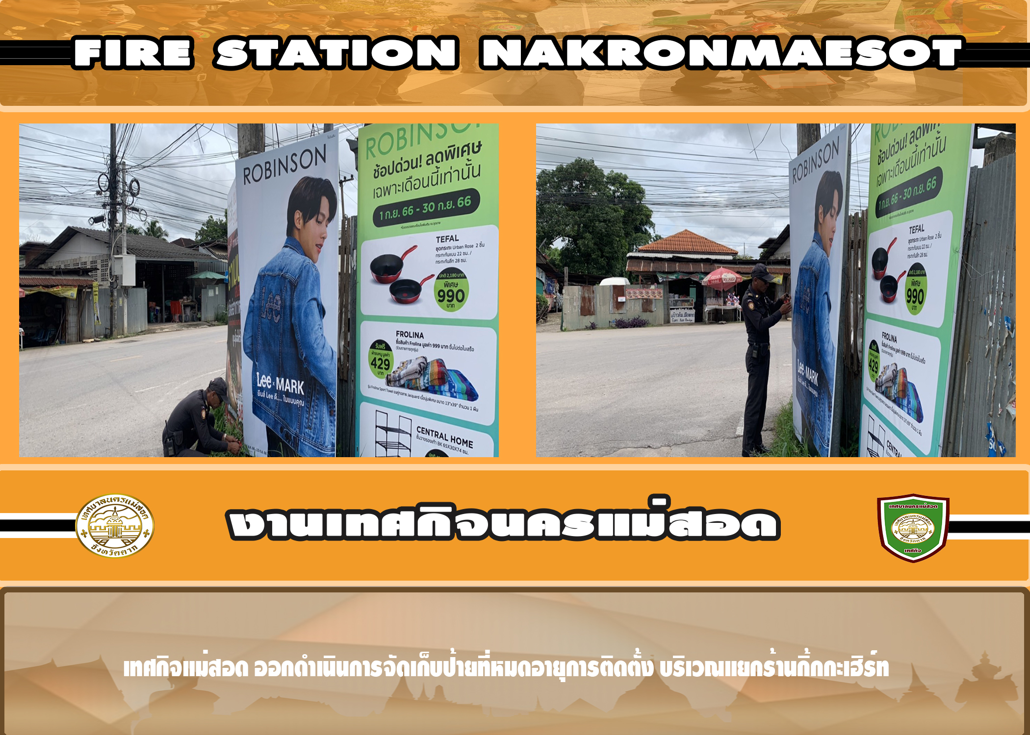 วันที่ 5 กันยายน 2566 เจ้าหน้าที่เทศกิจนครแม่สอด ดำเนินการจัดเก็บป้ายที่หมดอายุการติดตั้ง บริเวณแยกร้านกิ้กกะเฮิร์ท พื้นที่เทศบาลนครแม่สอด เพื่อให้เป็นระเบียบเรียบร้อยของบ้านเมือง