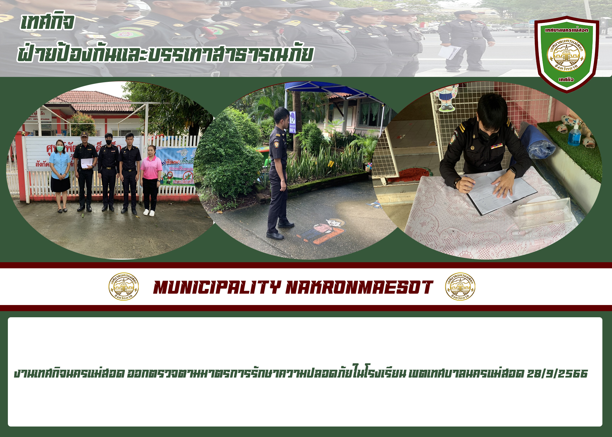 วันที่ 28 กันยายน 2566 เวลา 09.00 - 10.00 น. นายประเสริฐ ปวงละคร นายกเทศมนตรีนครแม่สอด มอบหมายให้ งานเทศกิจ ออกตรวจตราดูแลความเรียบร้อยของศูนย์พัฒนาเด็กก่อนวัยเรียนให้เข้มข้นขึ้น รวมถึงโรงเรียนในเขตเทศบาลนครแม่สอด เพื่อรักษาความปลอดภัยของนักเรียน ครู ในสถานศึกษา เช่น อุบัติเหตุจากอาคารเรียน อาคารประกอบ อุบัติเหตุจาก บริเวณสถานศึกษา สภาพแวดล้อมของสถานศึกษา เป็นต้น