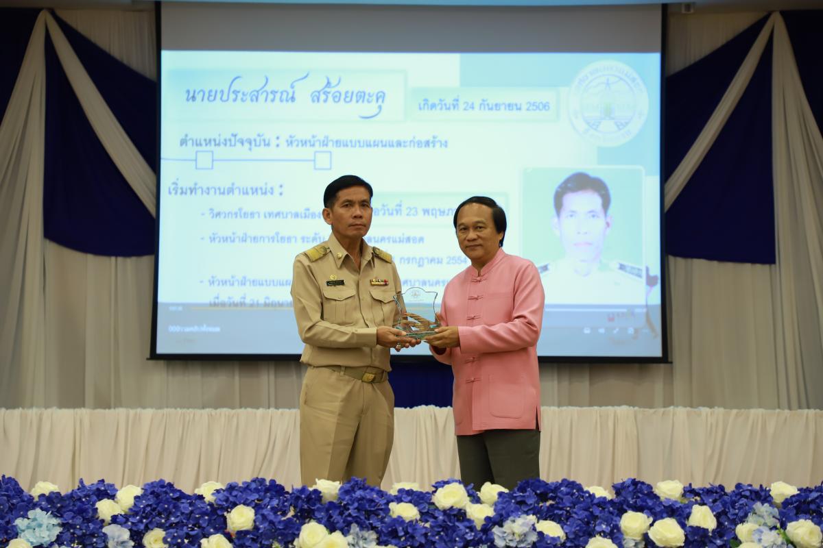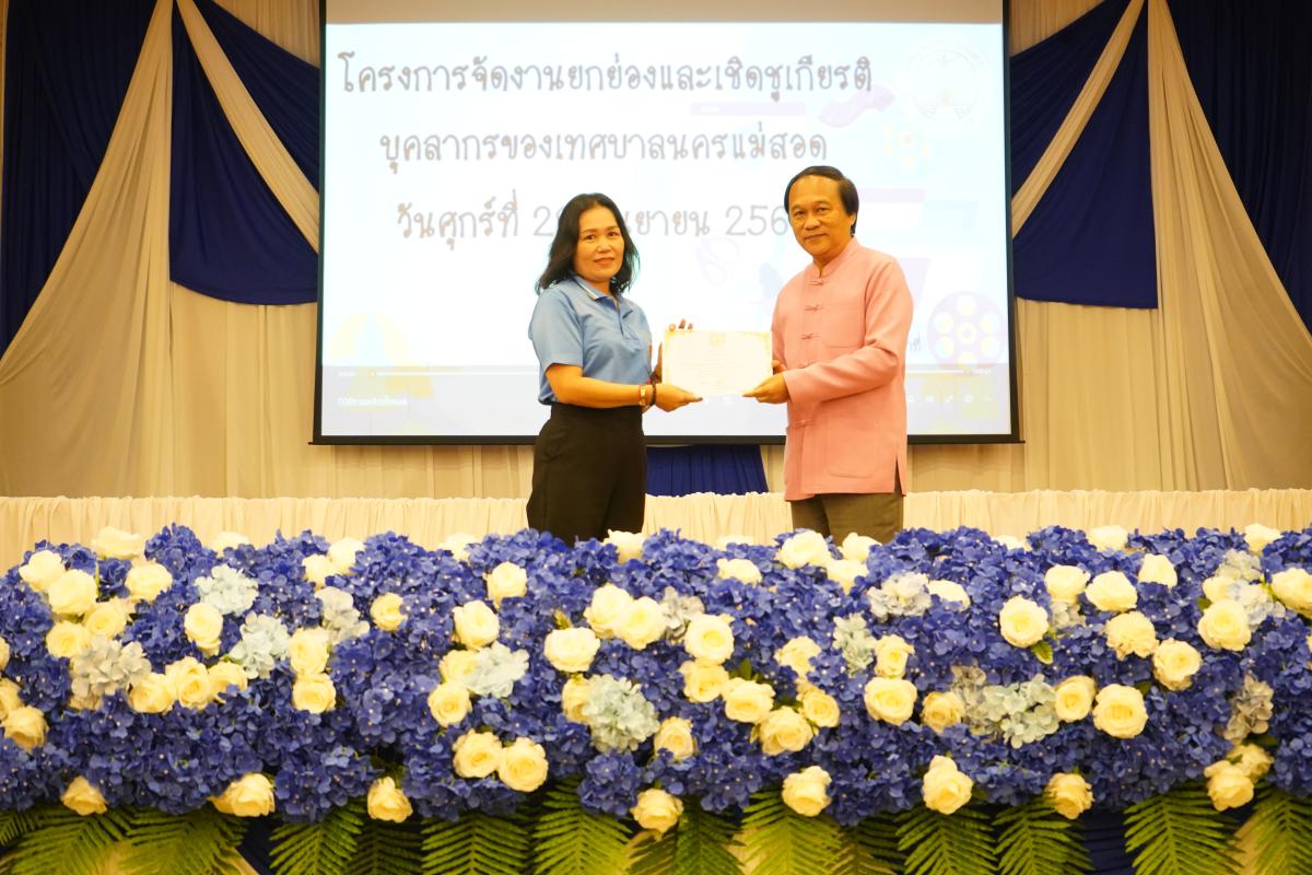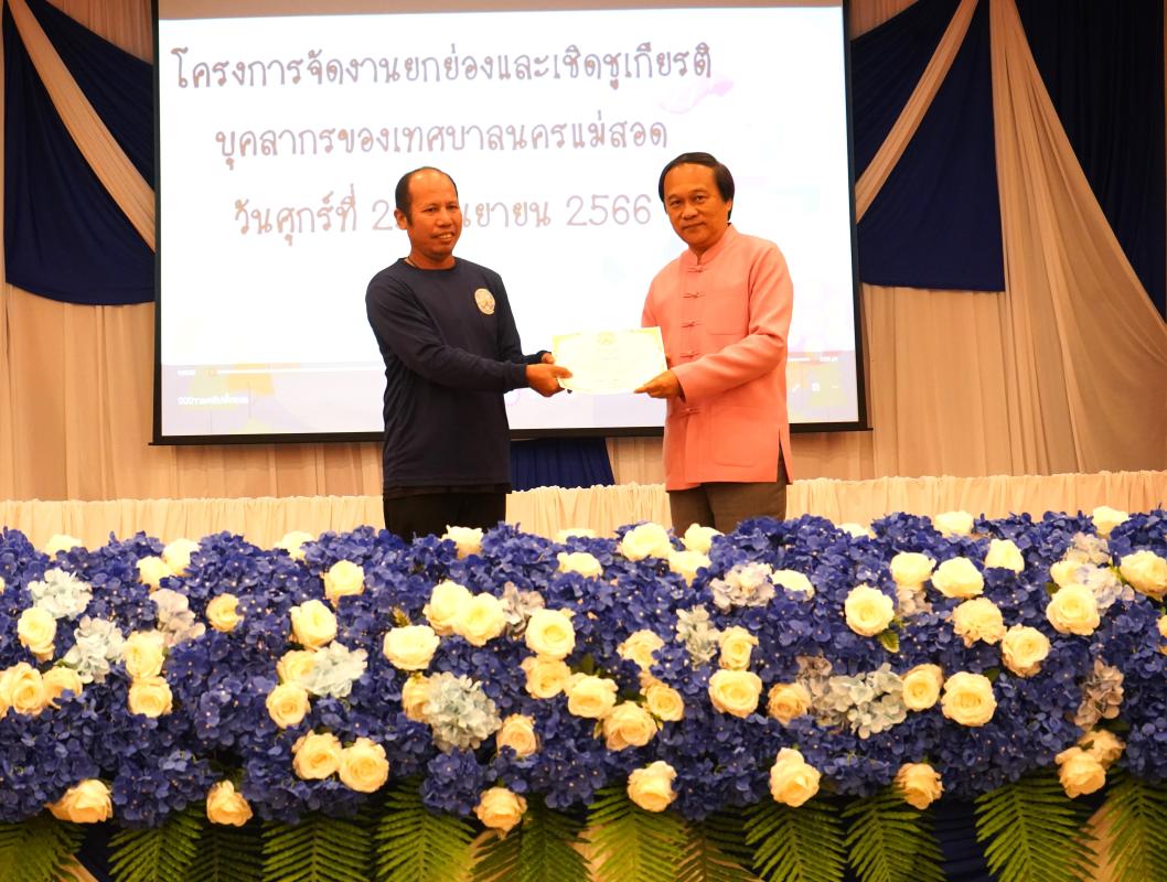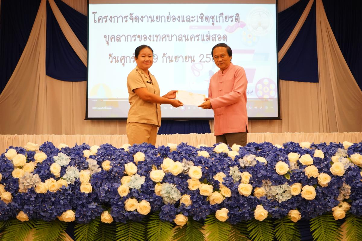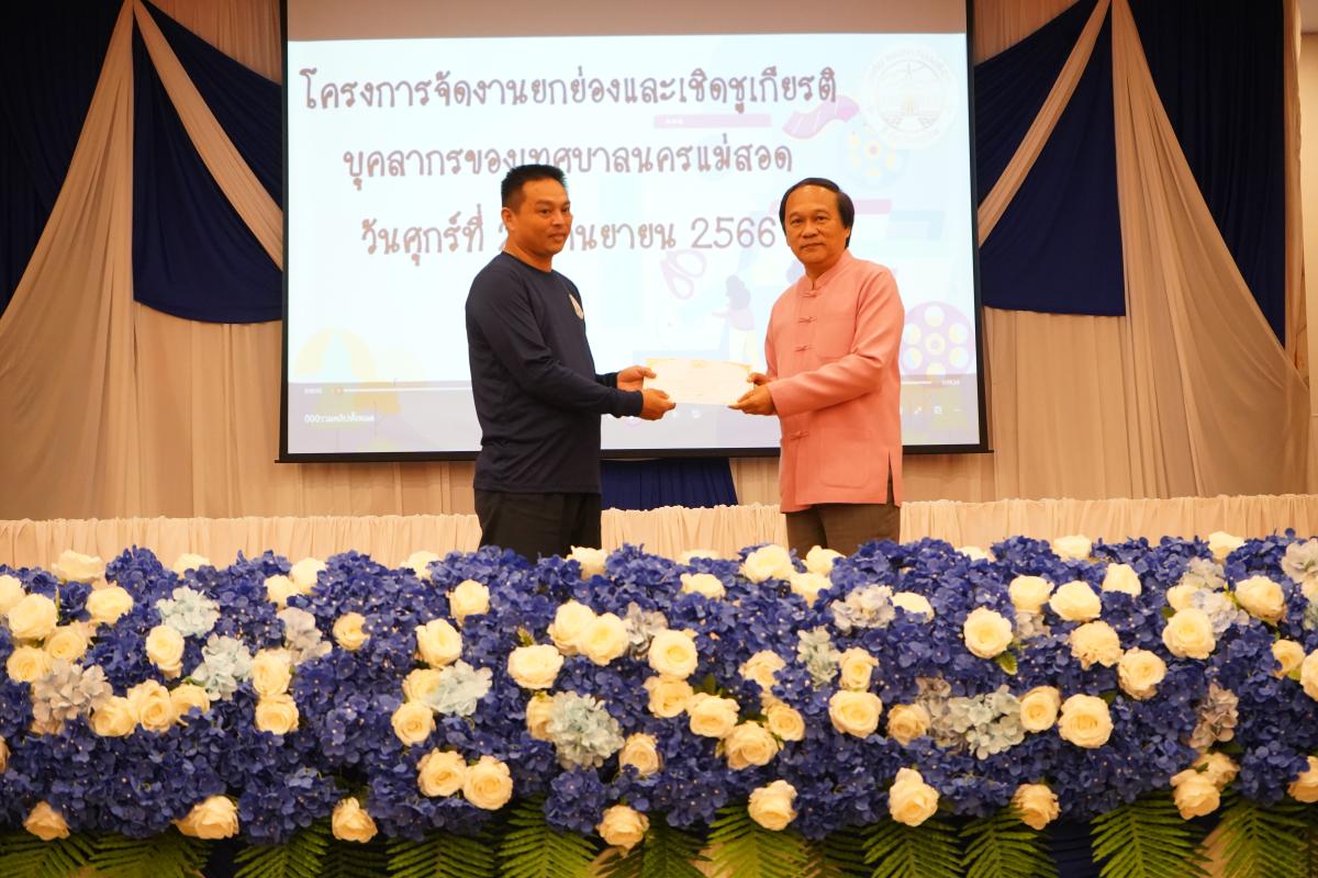 และ เป็นประธานเปิดโครงการจัดงานยกย่องและเชิดชูเกียรติบุคลากรของเทศบาลนครแม่สอด พร้อมด้วยคณะผู้บริหาร สมาชิกสภาเทศบาล หัวหน้าส่วนราชการ ข้าราชการ และพนักงานเทศบาลนครแม่สอด เข้าร่วม