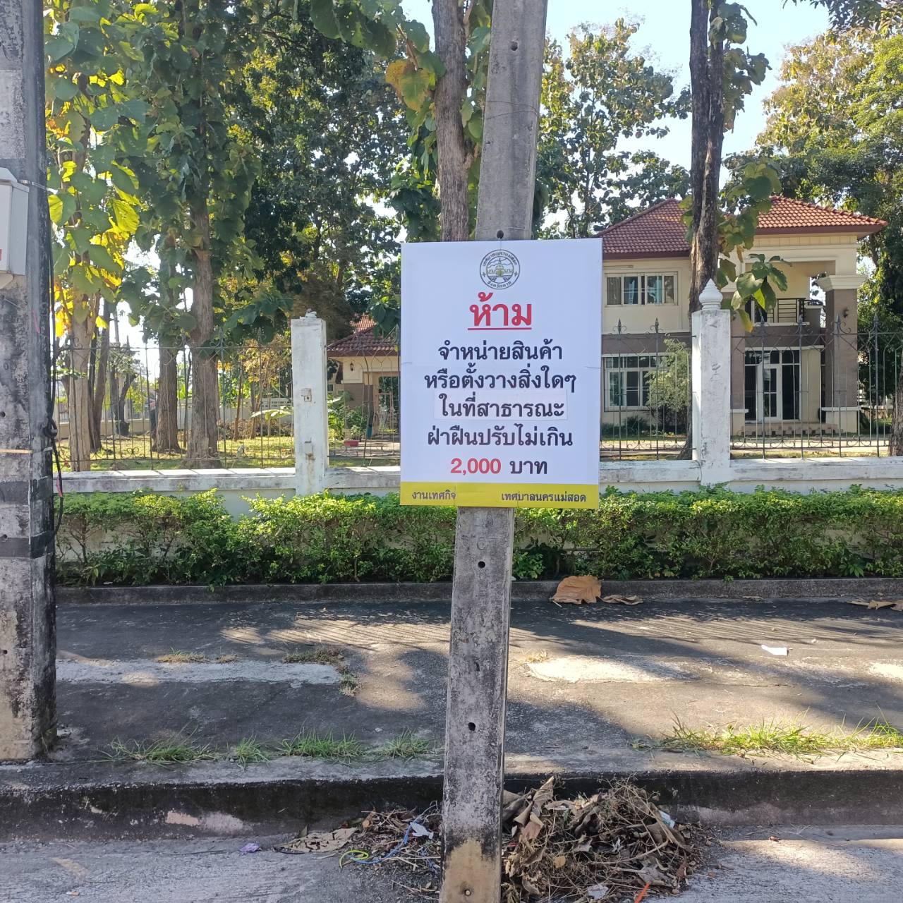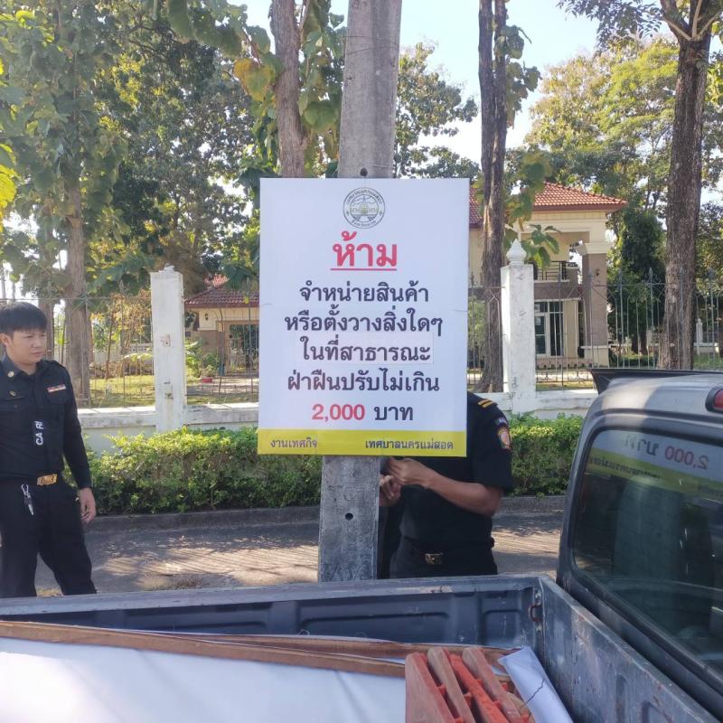 วันที่ 21 พฤศจิกายน 2566 เวลา 10.00 น. เจ้าหน้าที่เทศกิจนครแม่สอด ออกดำเนินการติดตั้งป้ายห้ามจำหน่ายสินค้าหรือห้ามวางสิ่งใดๆ ในที่สาธารณะ หากฝ่าฝืนปรับไม่เกิน 2000 บาทพื้นที่เทศบาลนครแม่สอด