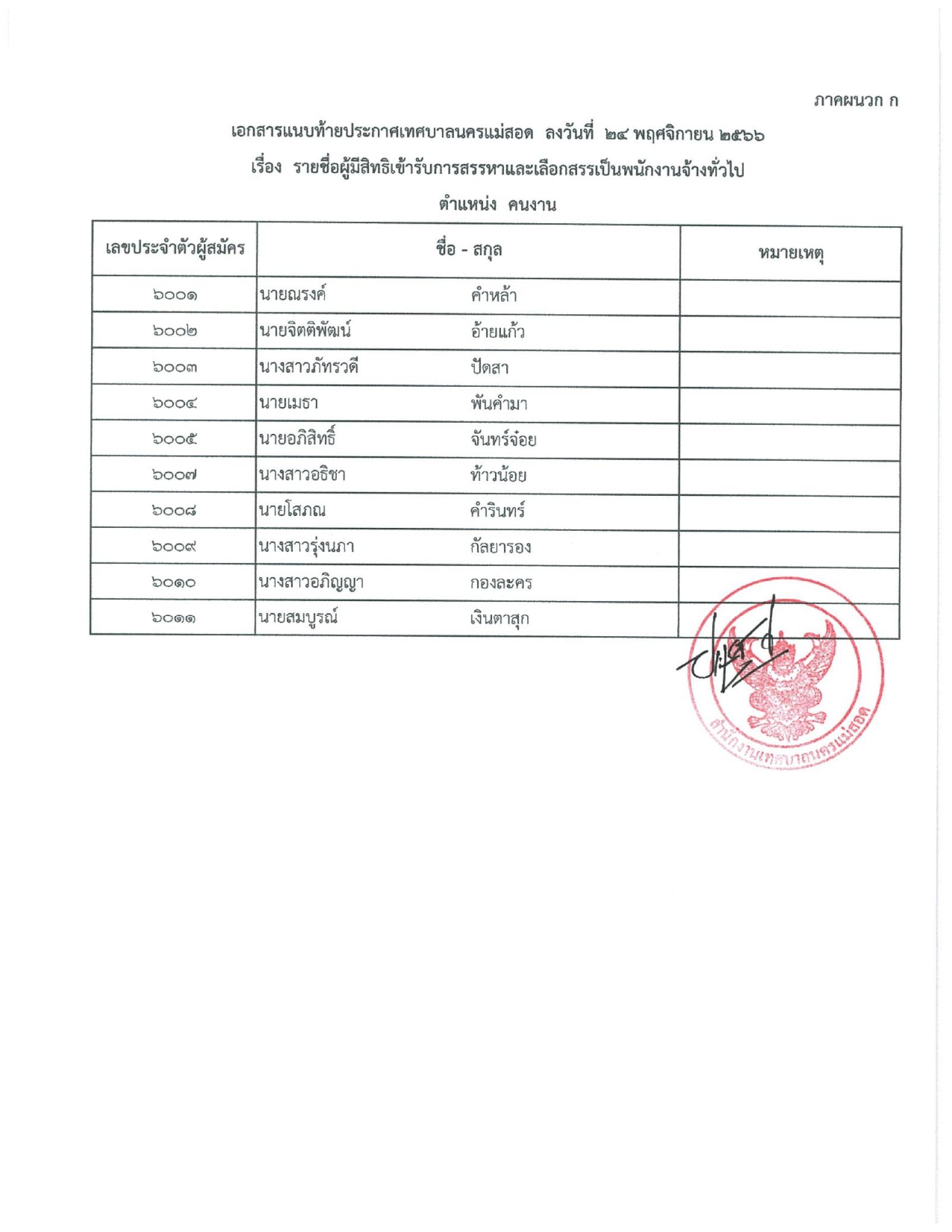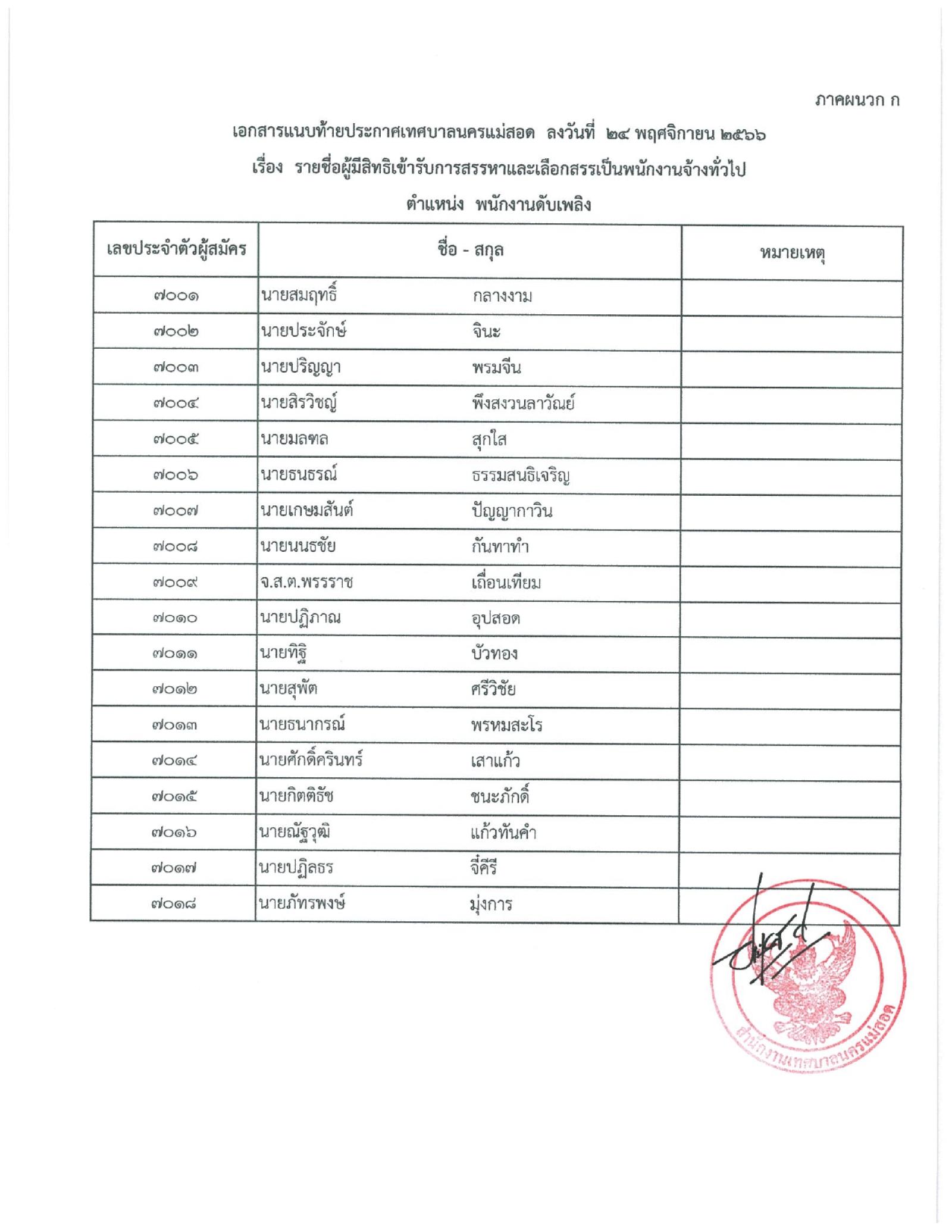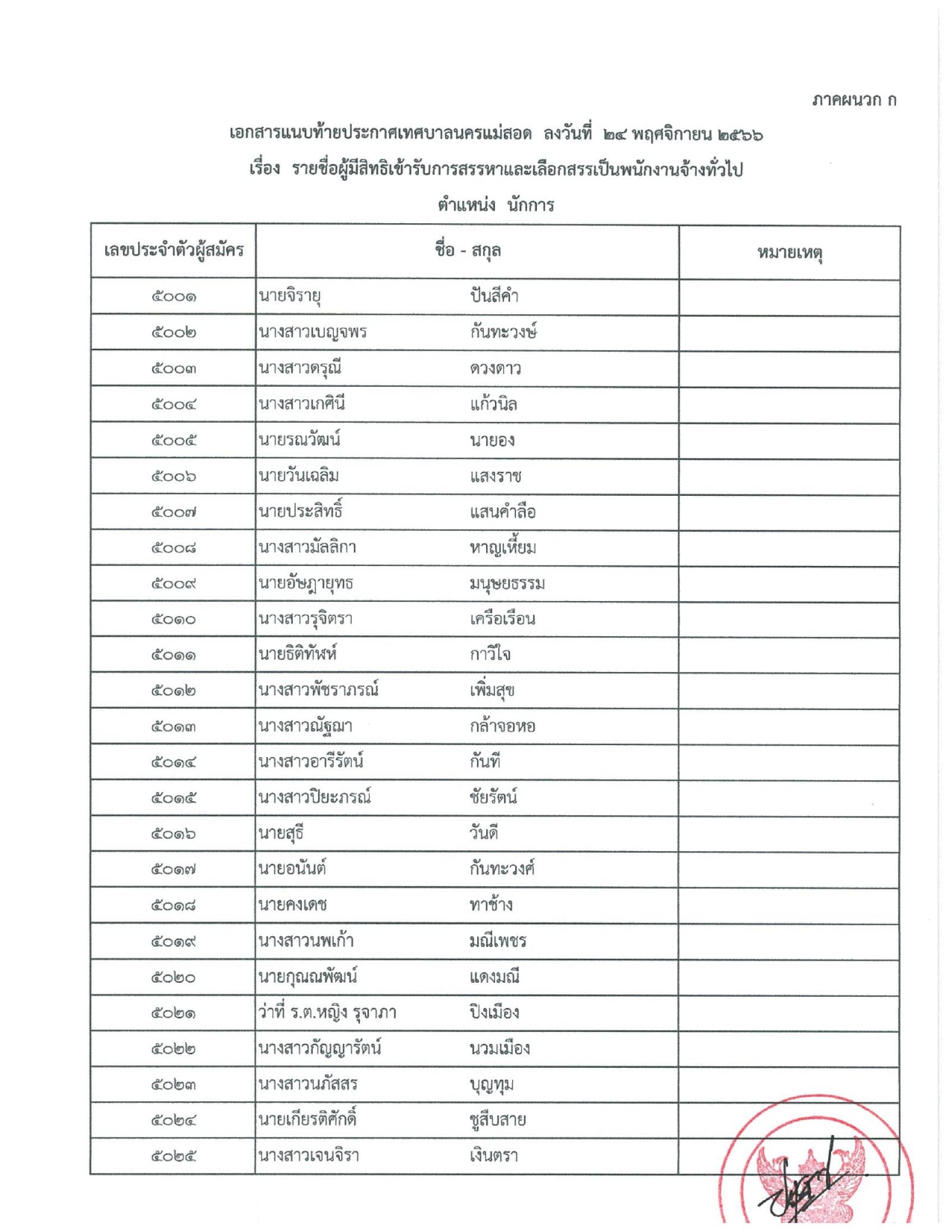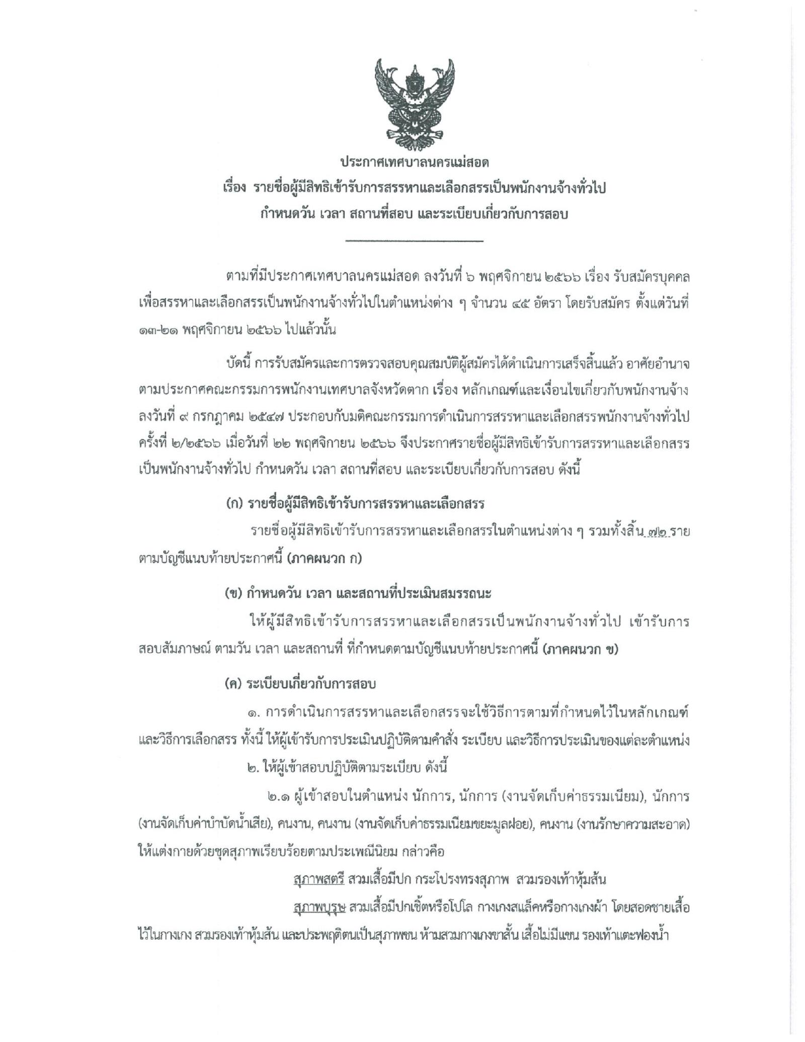 ประกาศเทศบาลนครแม่สอด เรื่อง รายชื่อผู้มีสิทธิเข้ารับการสรรหาและเลือกสรรเป็นพนักงานจ้างทั่วไป กำหนดวัน เวลา สถานที่สอบ และระเบียบเกี่ยวกับการสอบ